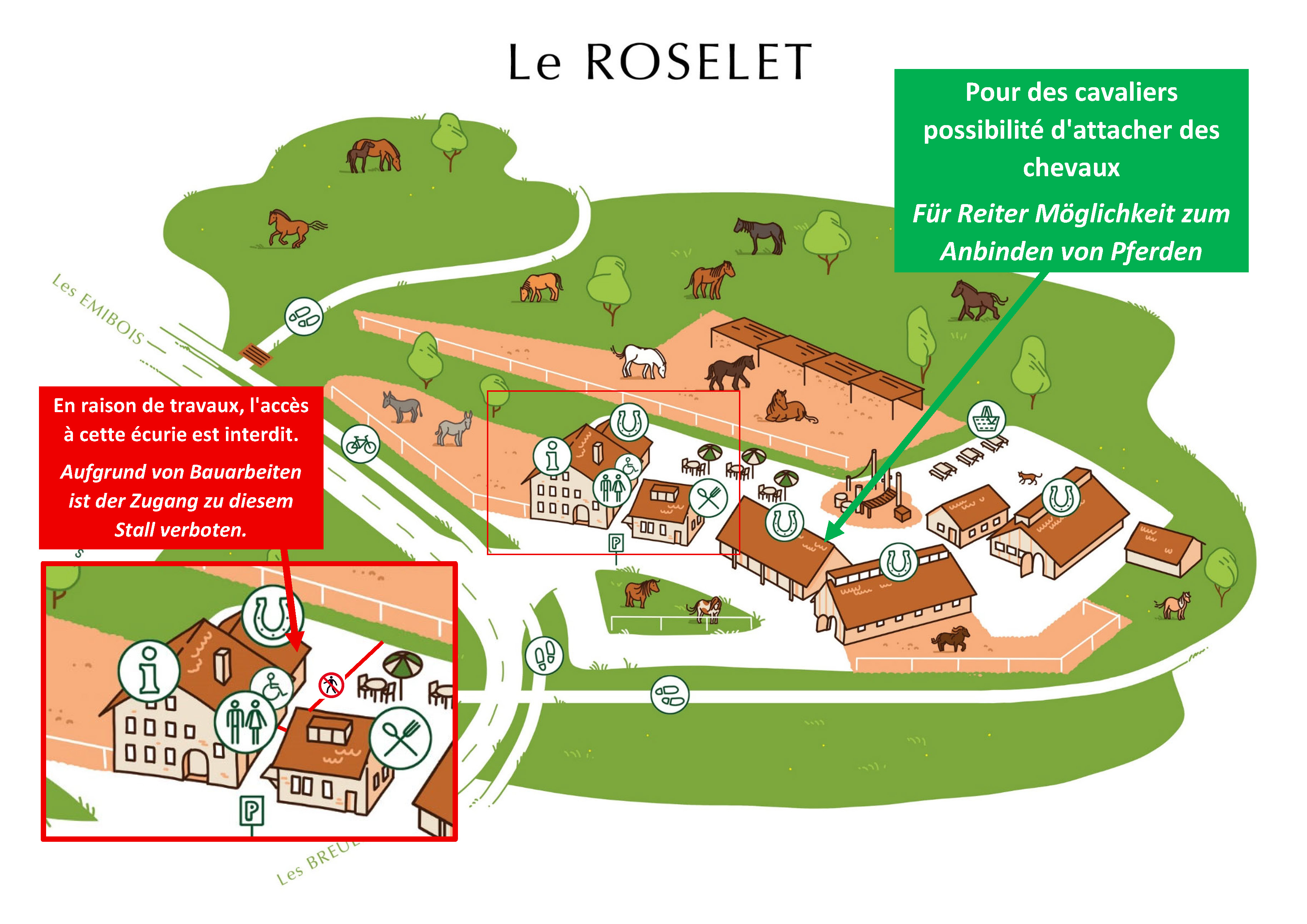 Aufgrund von Bauarbeiten auf unserer Station Le Roselet ist der Zugang zu Stall 1 sowie zum Anbindeplatz vorübergehend gesperrt.