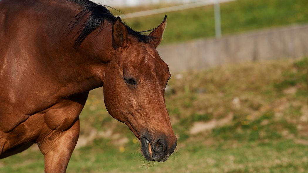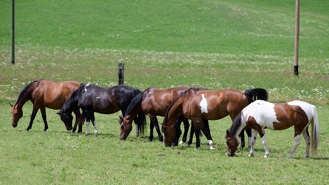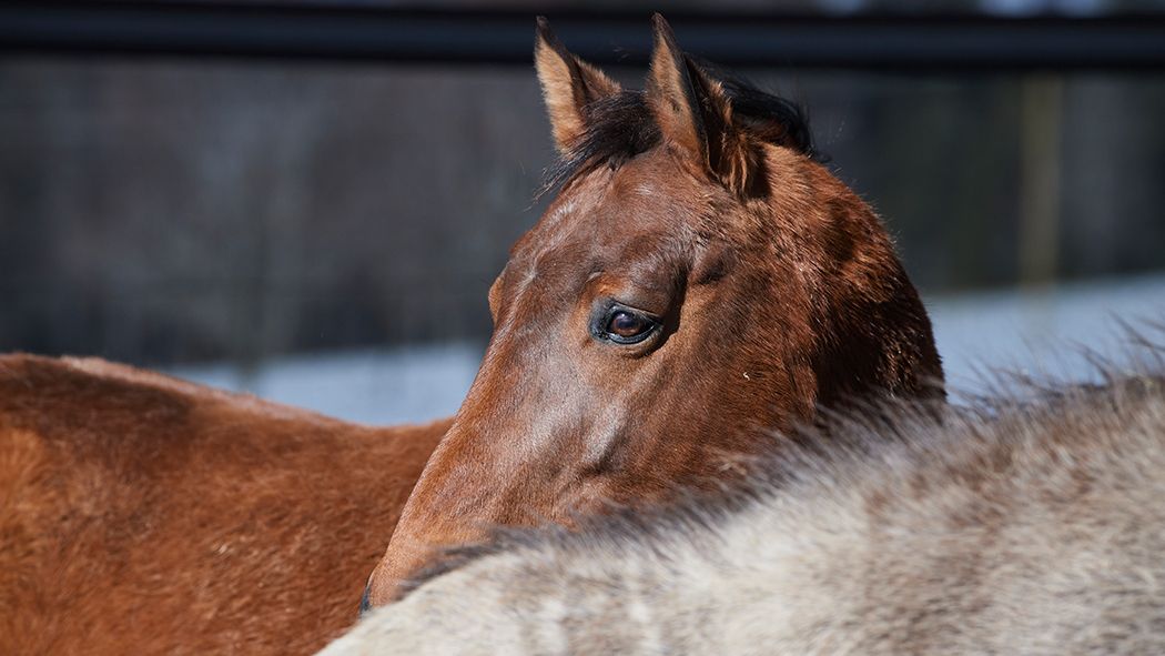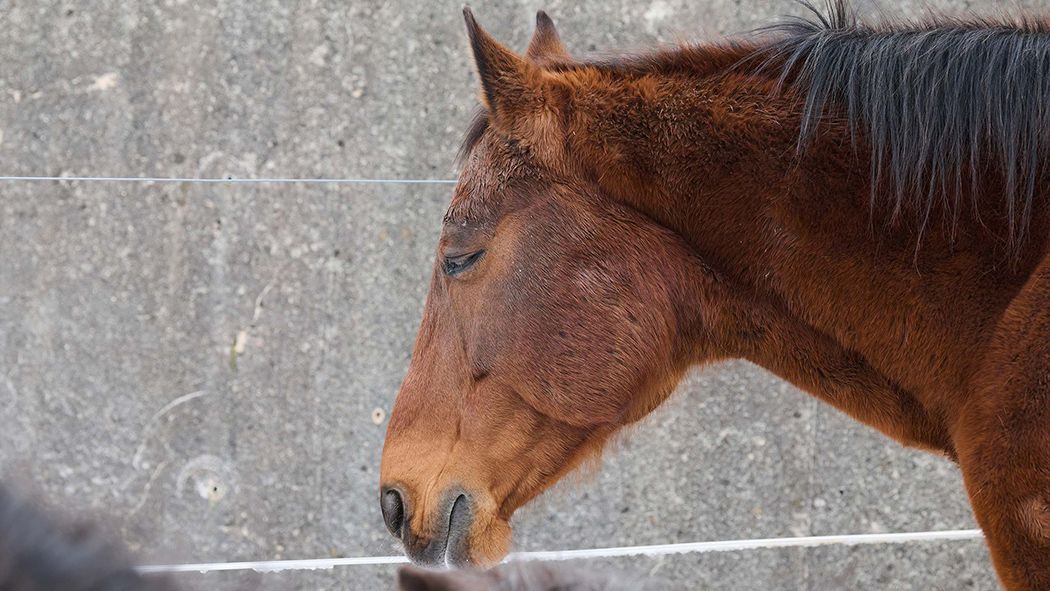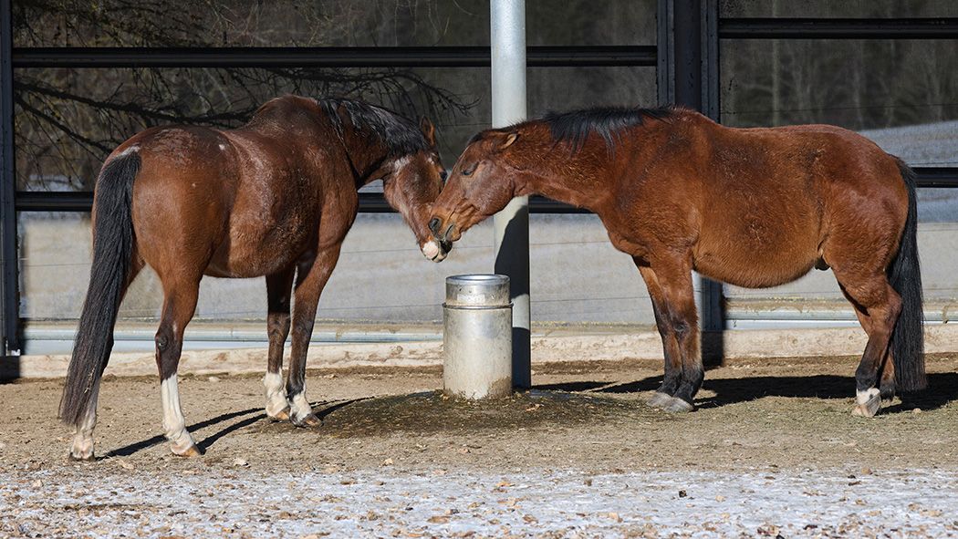 Der Braune war heute Morgen schon ganz cool in der Gruppe, zeigt sich aber nach wie vor sehr dominant. So lässt Ladino nur ungern einen anderen Wallach neben sich fressen. Mit den Stuten nimmt er da schon eher mal Kontakt durch das Fressgitter auf. Noch trägt Ladino ein Halfter, damit er von den Pflegern in seine Box geführt werden kann. Sobald er "sein" neues Zuhause kennt, darf er dann wie alle anderen frei in der Herde rein und raus.