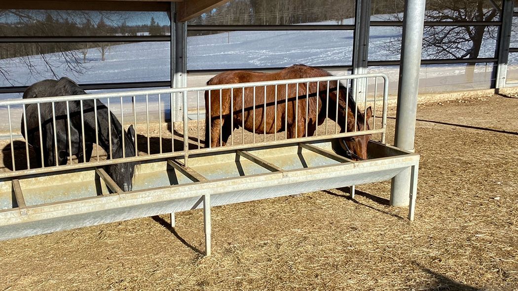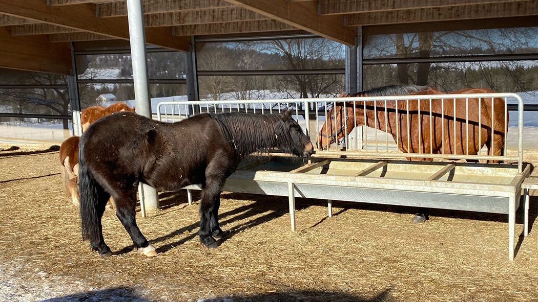 Ladino hat sich schon ziemlich gut eingelebt und geniesst das Fressen auf dem Trockenplatz inmitten der Ladys immer mehr. Umrahmt von Princess, Lotti und Dandy lässt es sich gut leben. Eigentlich hat der Wallach schon genügend Reserven auf den Rippen, aber seine Gedanken scheinen sich aktuell um nichts Anderes zu drehen. Draussen auf den grossen, verschneiten Wiesen ist Ladino bisher kaum anzutreffen.