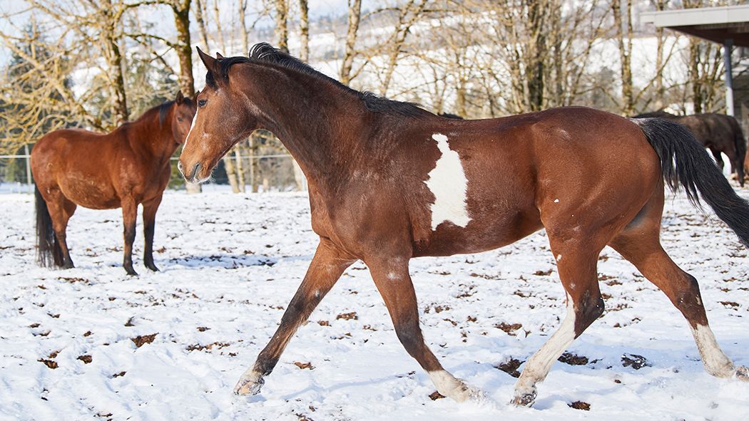 Trotz seiner stattlichen Rundungen ist Ladino fit und munter. Die weisse Schneepracht, welche den Jura gegen Ende November eisig einhüllt, weckt bei unseren Senioren die Lebensgeister – so auch bei Ladino. Wild galoppiert er über die verschneiten Abhänge und tobt sich aus. Besonders die Wallache spielen im Winter viel und jagen sich gerne kreuz und quer über die Weiden. Da wird gebockt und auch mal gezwickt, aber Verletzungen sind bei den wilden Spielen zum Glück selten.