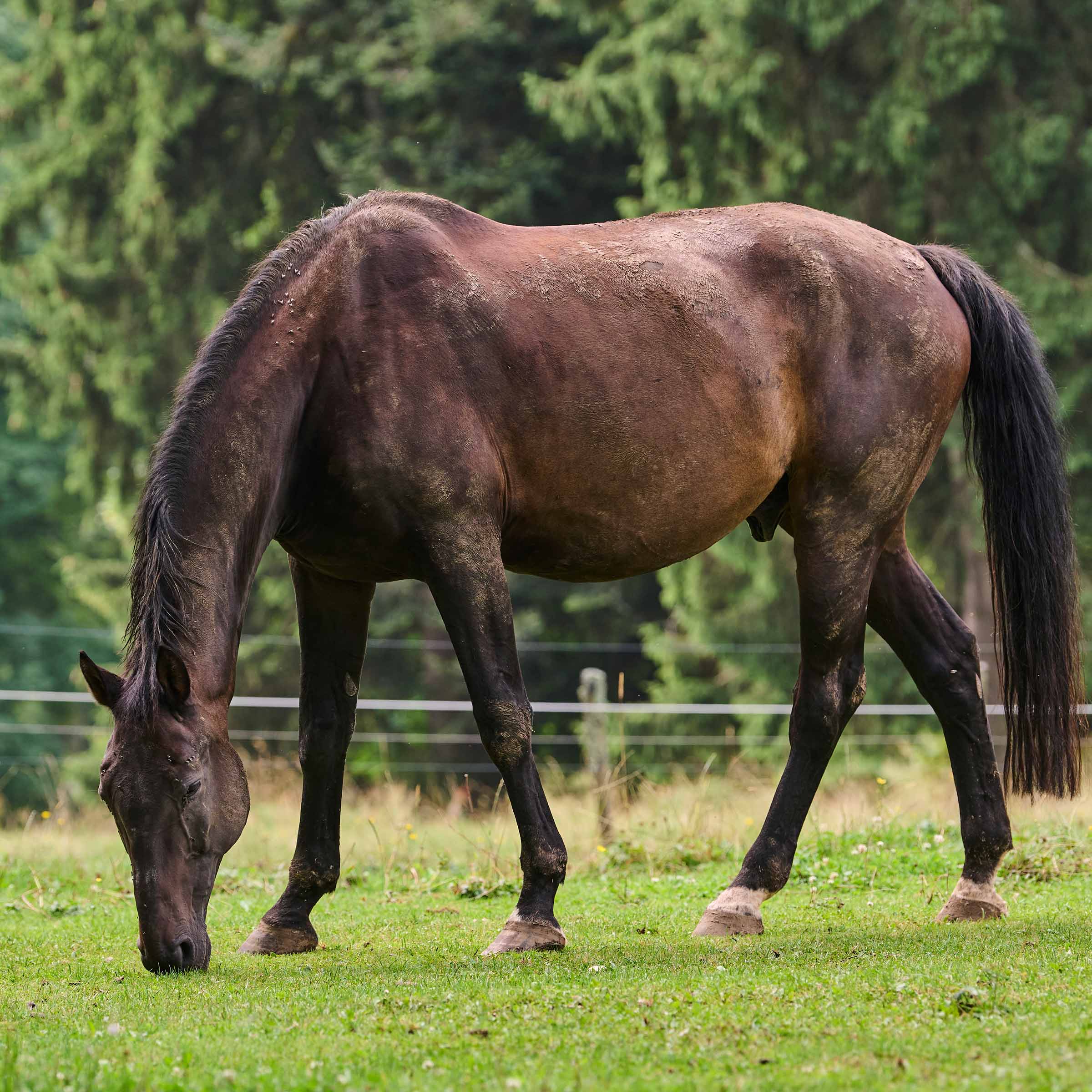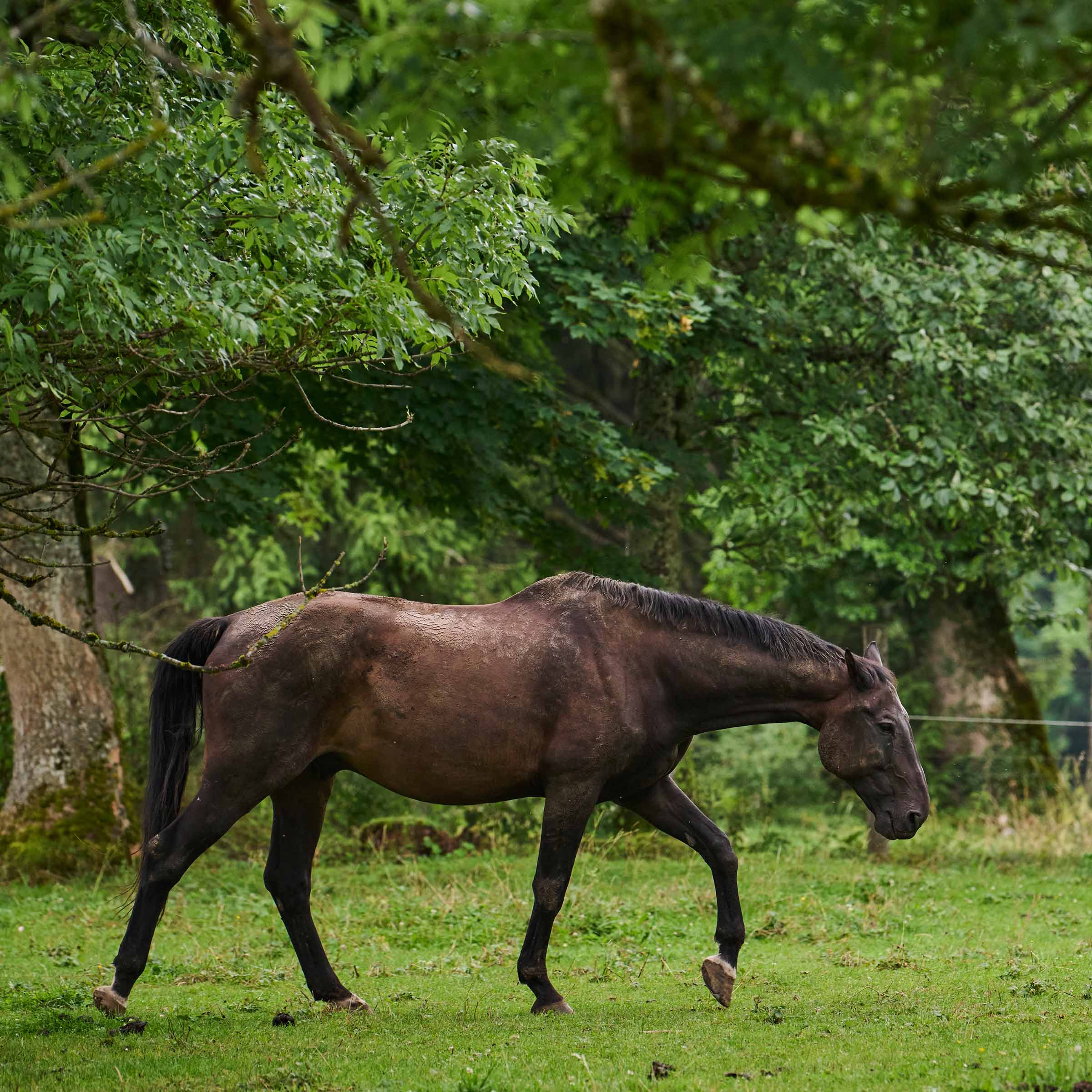 Aracon ist ein grosser, dunkelbrauner Wallach. Lediglich drei seiner Füsse sind weiss gekrönt (eine schmale weisse Linie oberhalb des Hufes). 2004 in der Schweiz geboren, wurde Aracon als Dreijähriger von seiner zukünftigen Besitzerin eingeritten und ausgebildet. Neun Jahre später kaufte seine Bereiterin Aracon, und fortan lebte der grosse Dunkle in einem kleinen Privatstall in der Gruppe mit viel Weidegang. Jedes Jahr im September verbrachte Aracon Reitferien im Jura, und so war für seine Besitzerin auch klar, wo ihr vierbeiniger Partner seinen Ruhestand verbringen sollte. Nach der regulären Wartefrist zog Aracon im Sommer 2025 auf unseren Zauberberg Le Jeanbrenin.