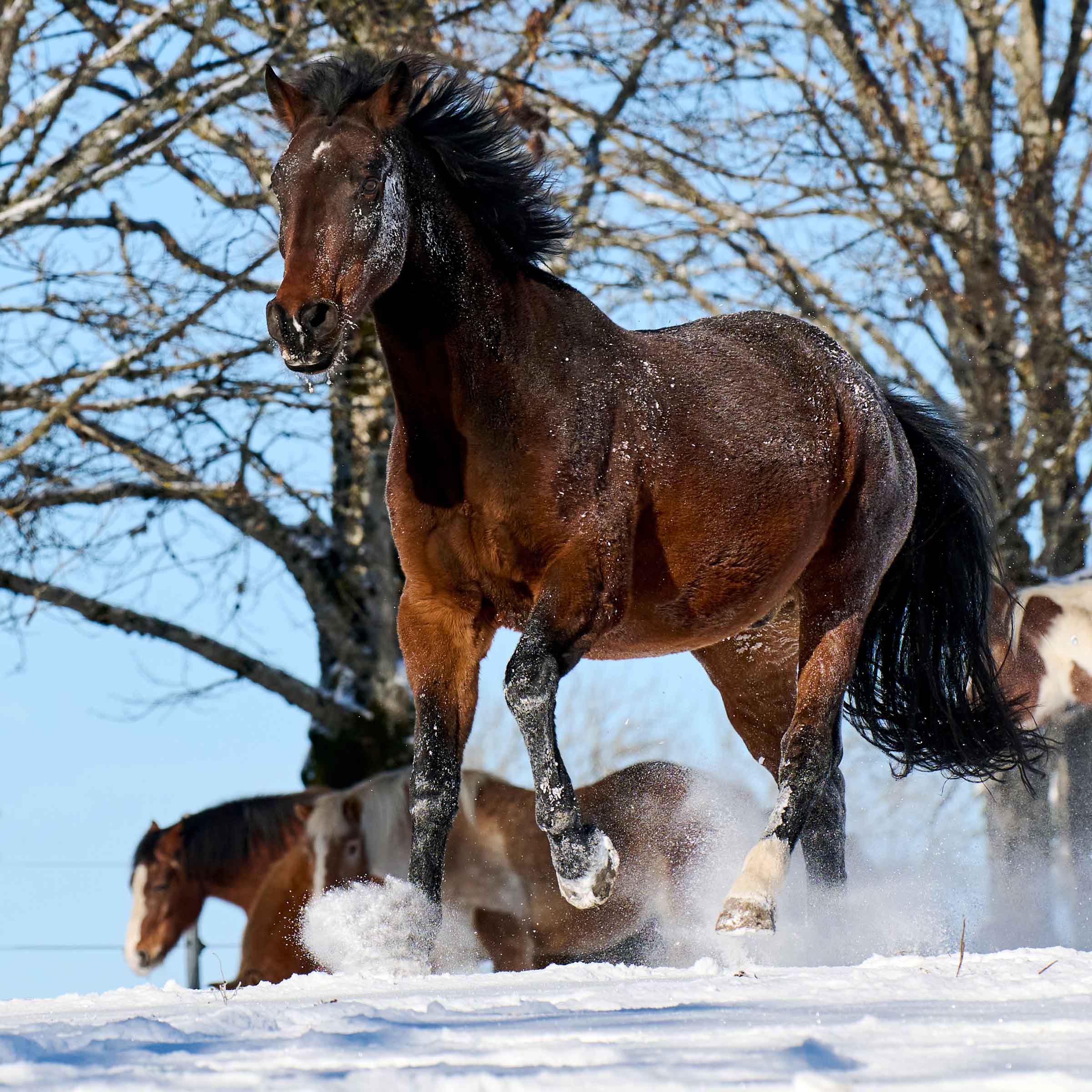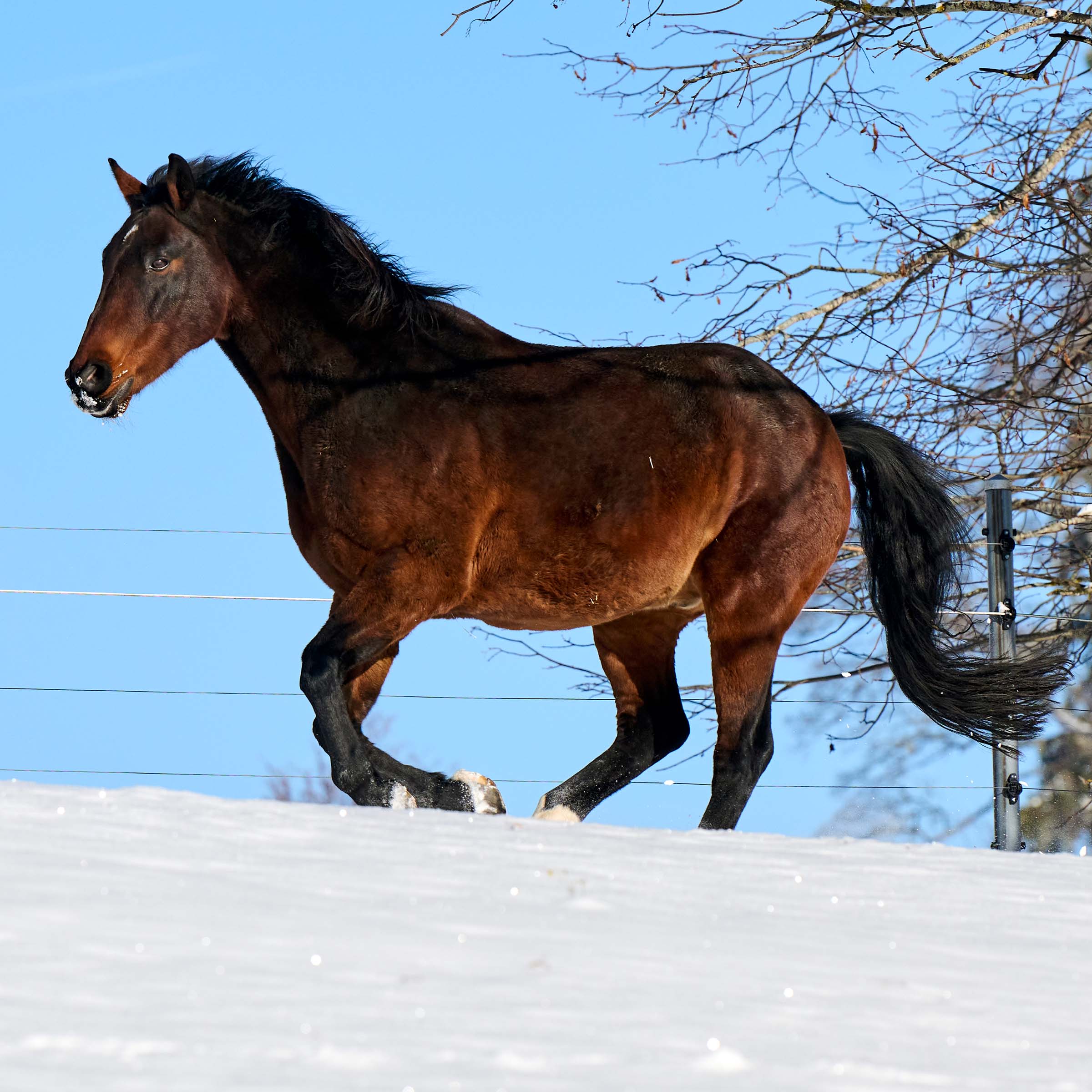 kleiner weisser Stern auf Stirn und dünner weisser Strich auf Nüstern; drei weisse Füsse (ausser vorne rechts)