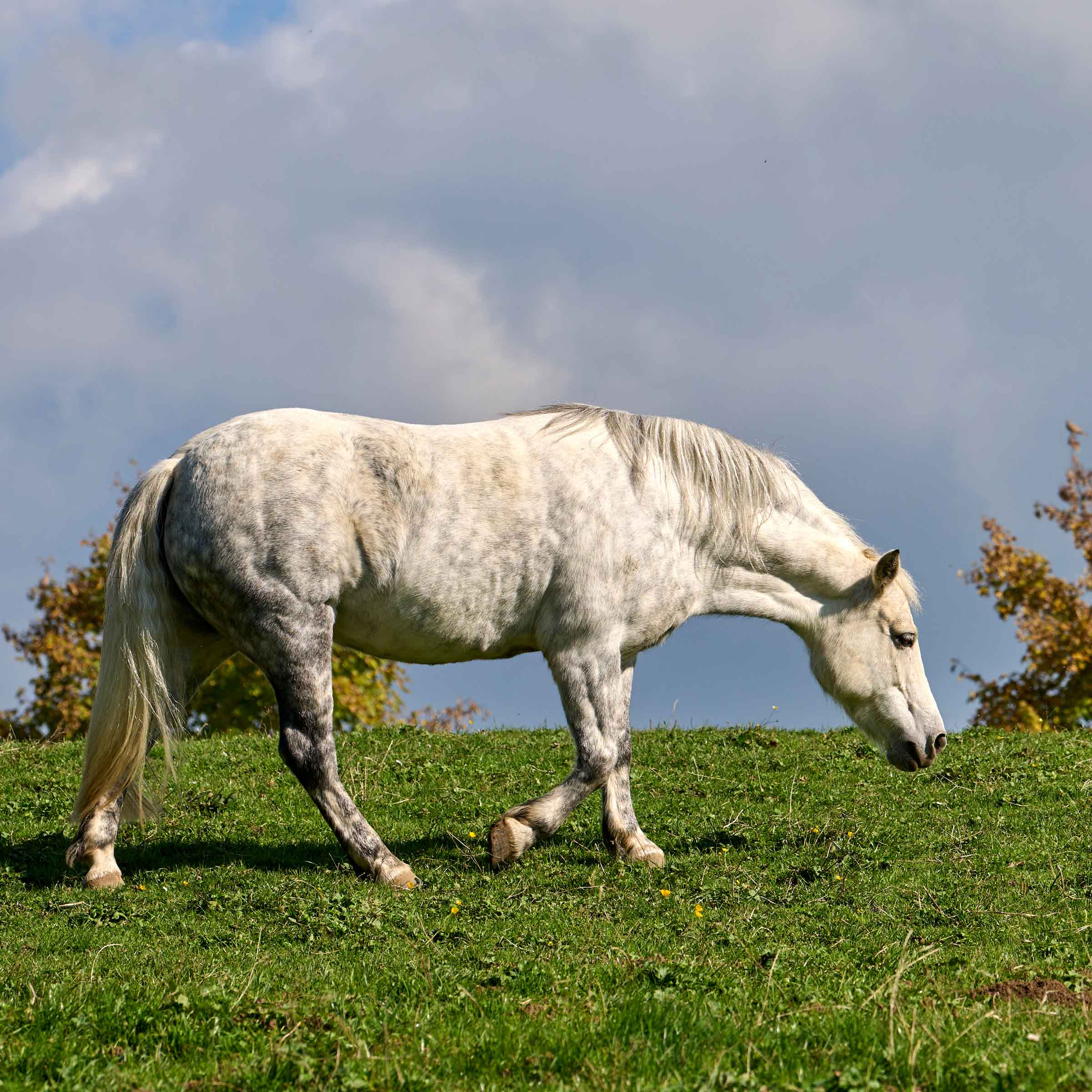 aktuell noch grau mit grossen, weissen Punkten (so genannter Apfelschimmel); wird mit jedem Jahr heller werden
