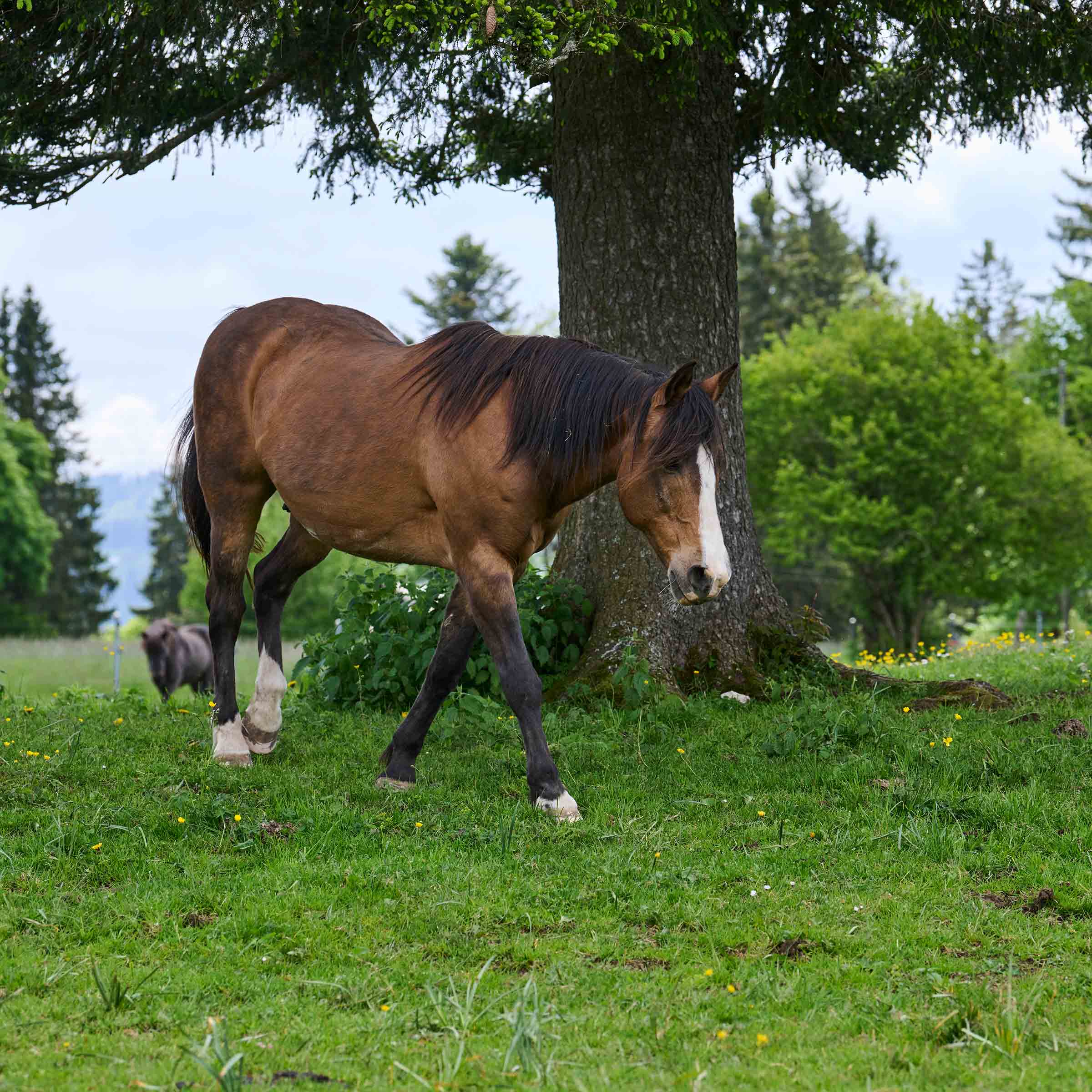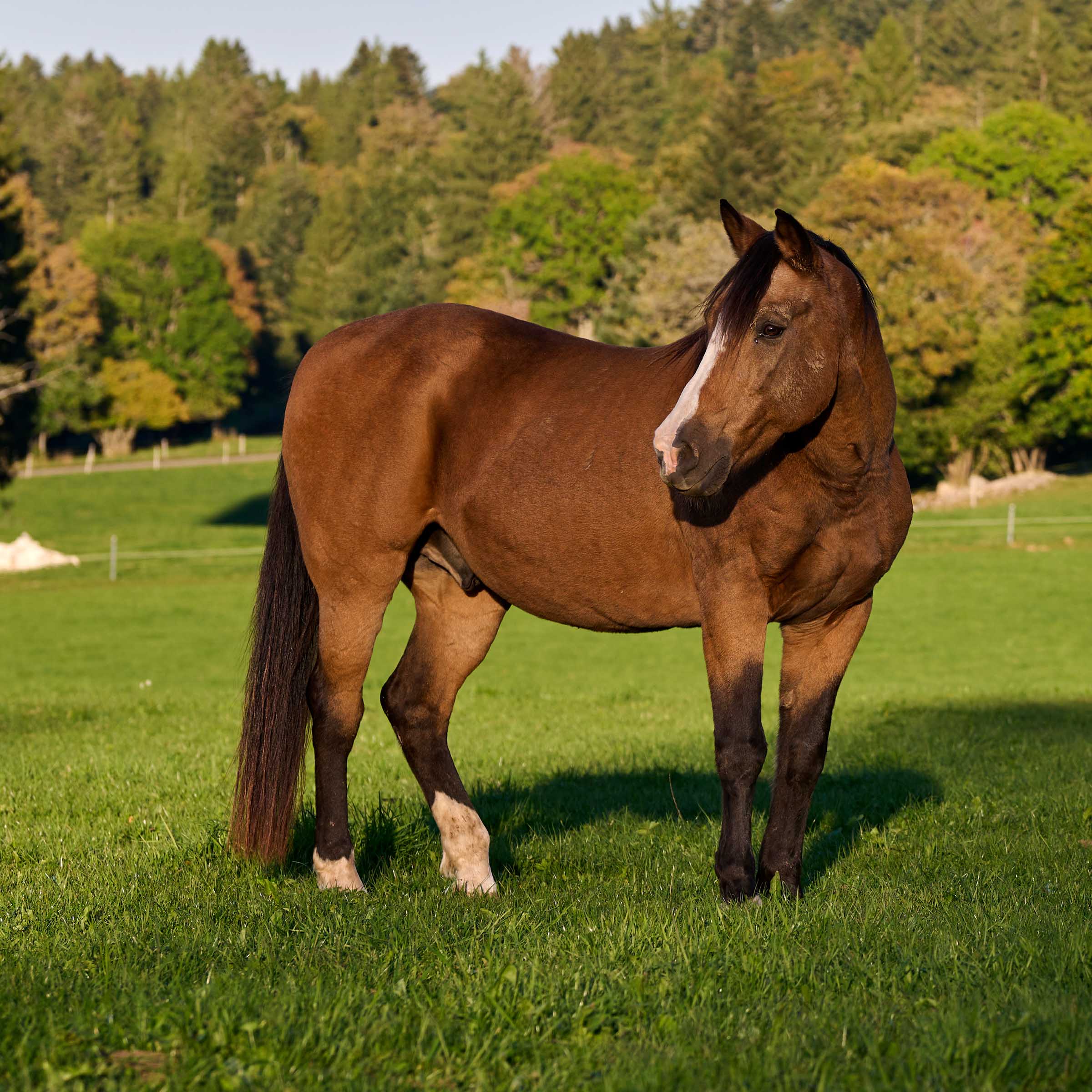 Das genaue Geburtsdatum und auch der Geburtsort dieses schönen Pferdes sind uns leider nicht bekannt. Seine letzte Besitzerin kaufte den eleganten Cruzado als 8jähriger. Cassius ist am 15. September 2022 nach Le Jeanbrenin umgezogen. Ohne weitere Infos über seine Vergangenheit, dafür aber sehr zur Erleichterung seiner Besitzerin, die mit schweren gesundheitlichen Problemen zu kämpfen hatte. Die Bezeichnung Cruzado wird auf der iberischen Halbinsel allen einheimischen Pferden gegeben, welche keine rein gezüchteten Andalusier oder Lusitanos sind. Cassius leidet leider an Hufrehe an den Vorderbeinen, einer schmerzhaften Entzündung im Huf. Dies hindert ihn aber nicht daran, mit seinen Artgenossen über unsere grossen Weiden zu galoppieren.