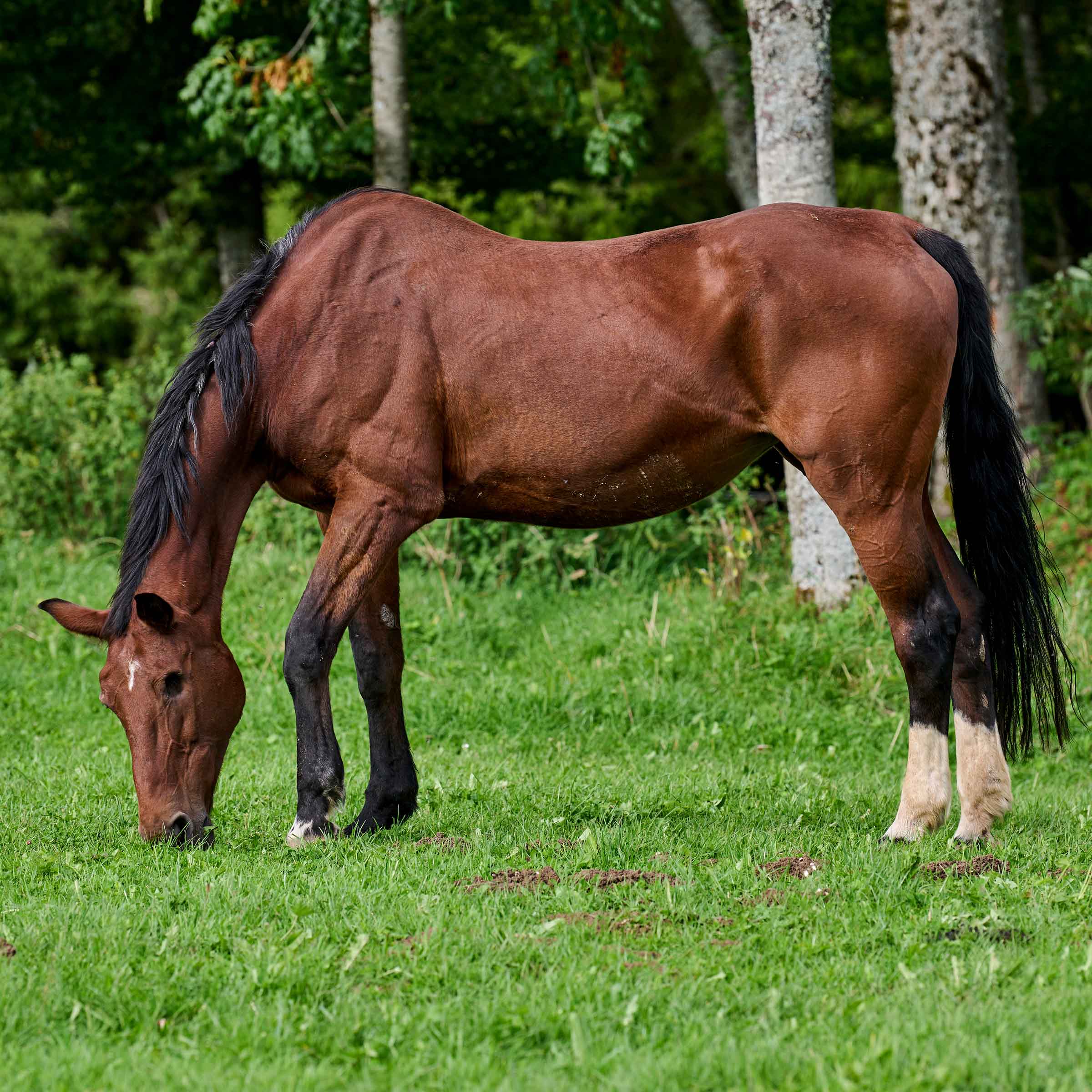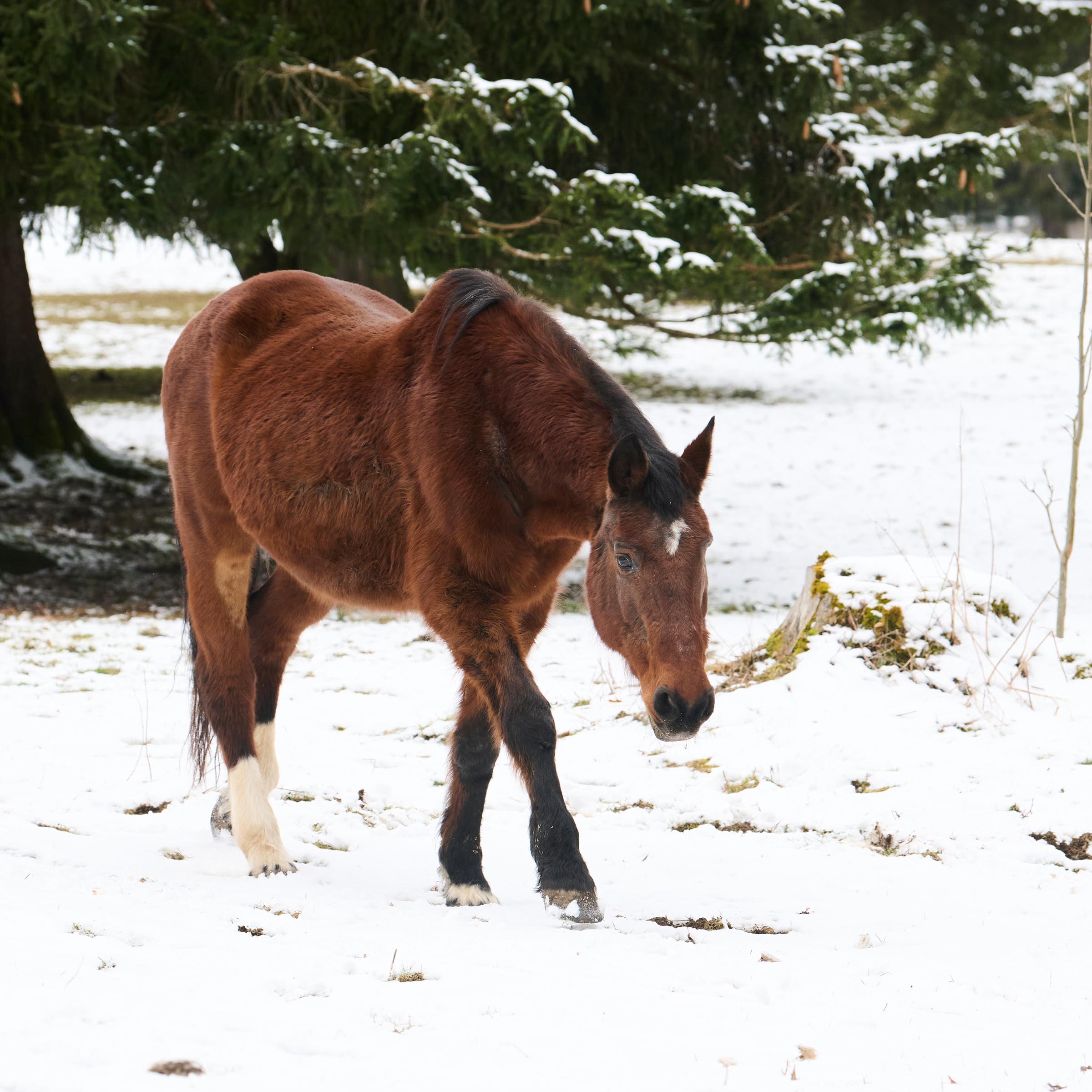 Kleiner Stern auf Stirn; zwei weisse Hinterbeine; linkes Auge fehlt