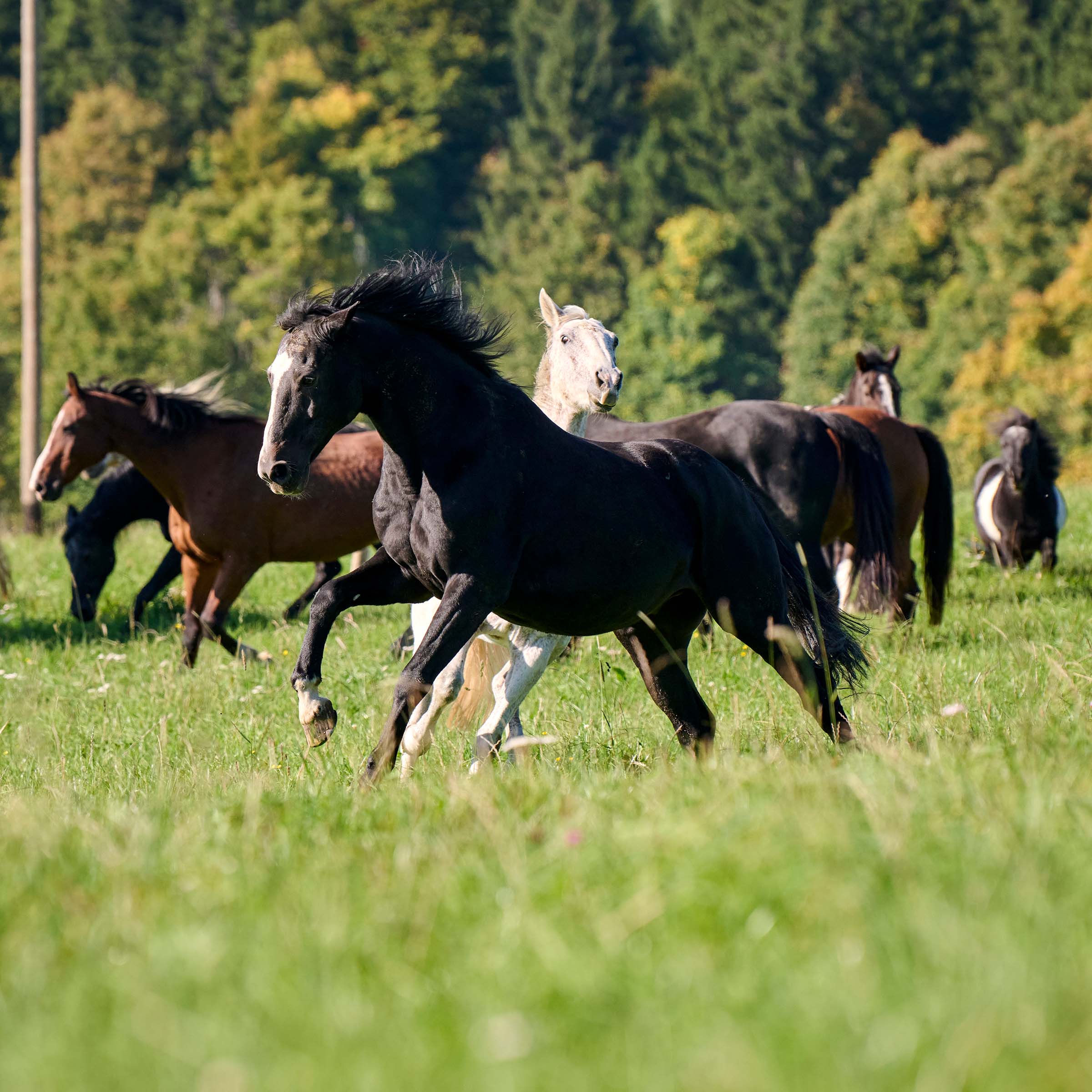 erscheint eher schwarz als dunkelbraun; weisse Blesse am Kopf; drei Weissabzeichen an den Beinen (ausser vorne links)