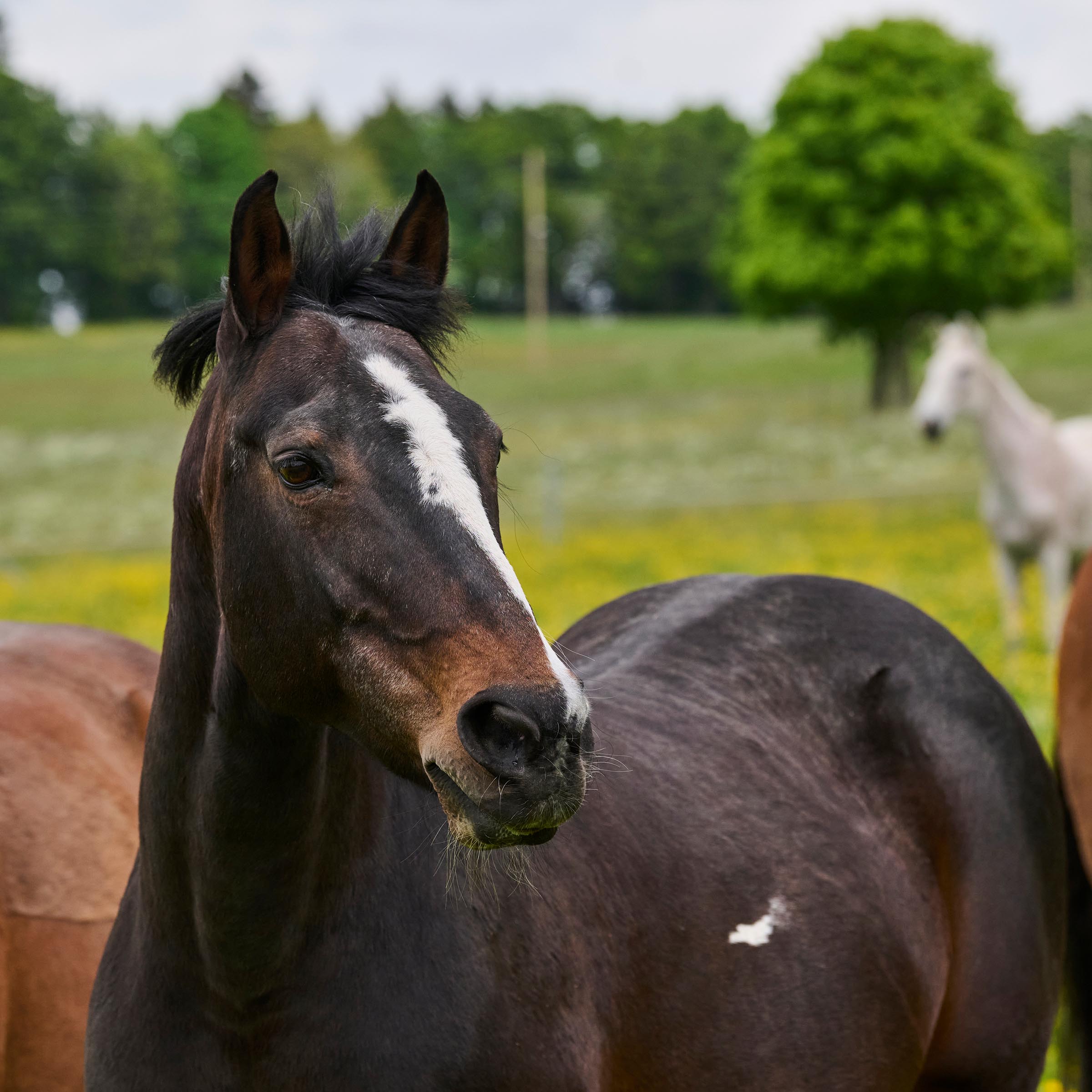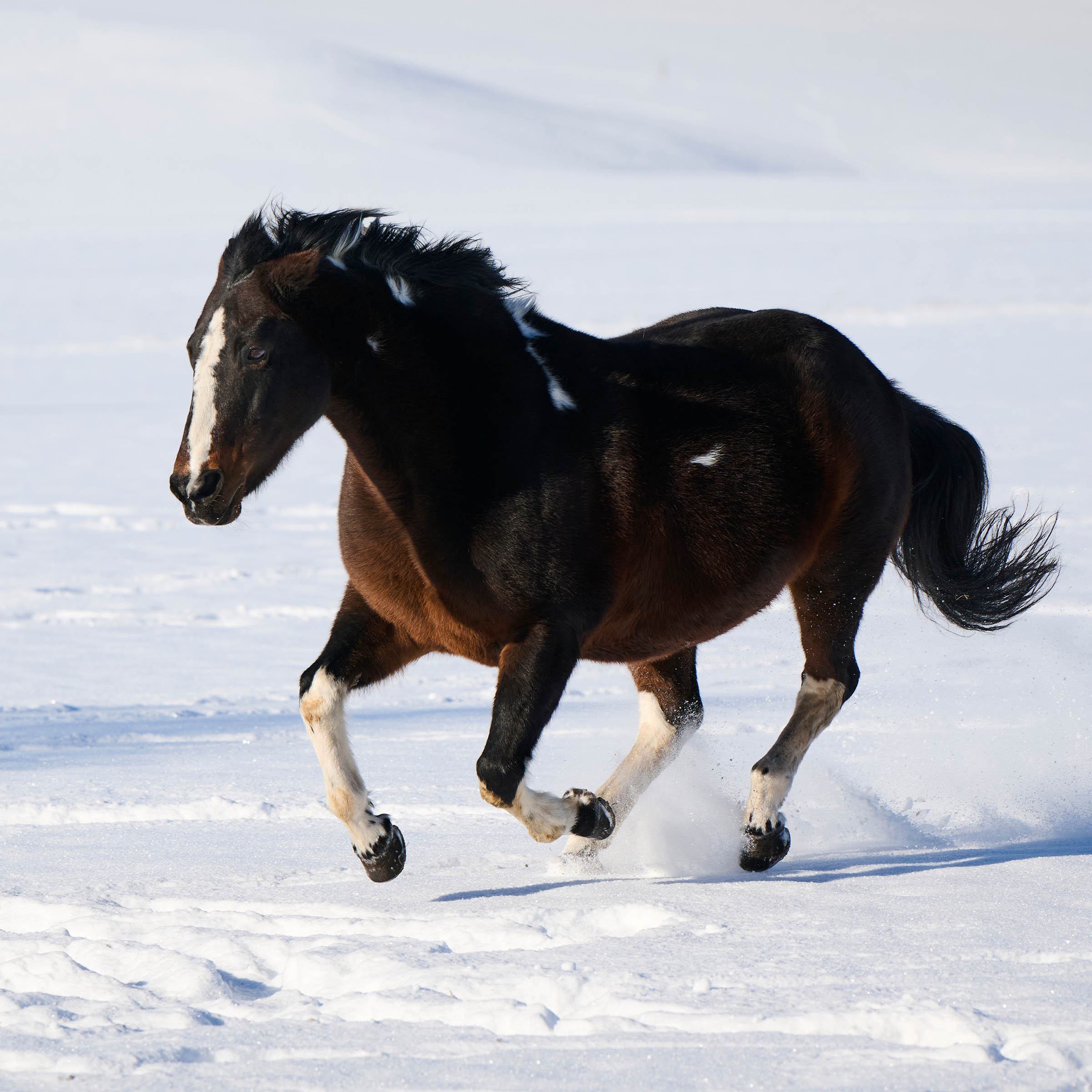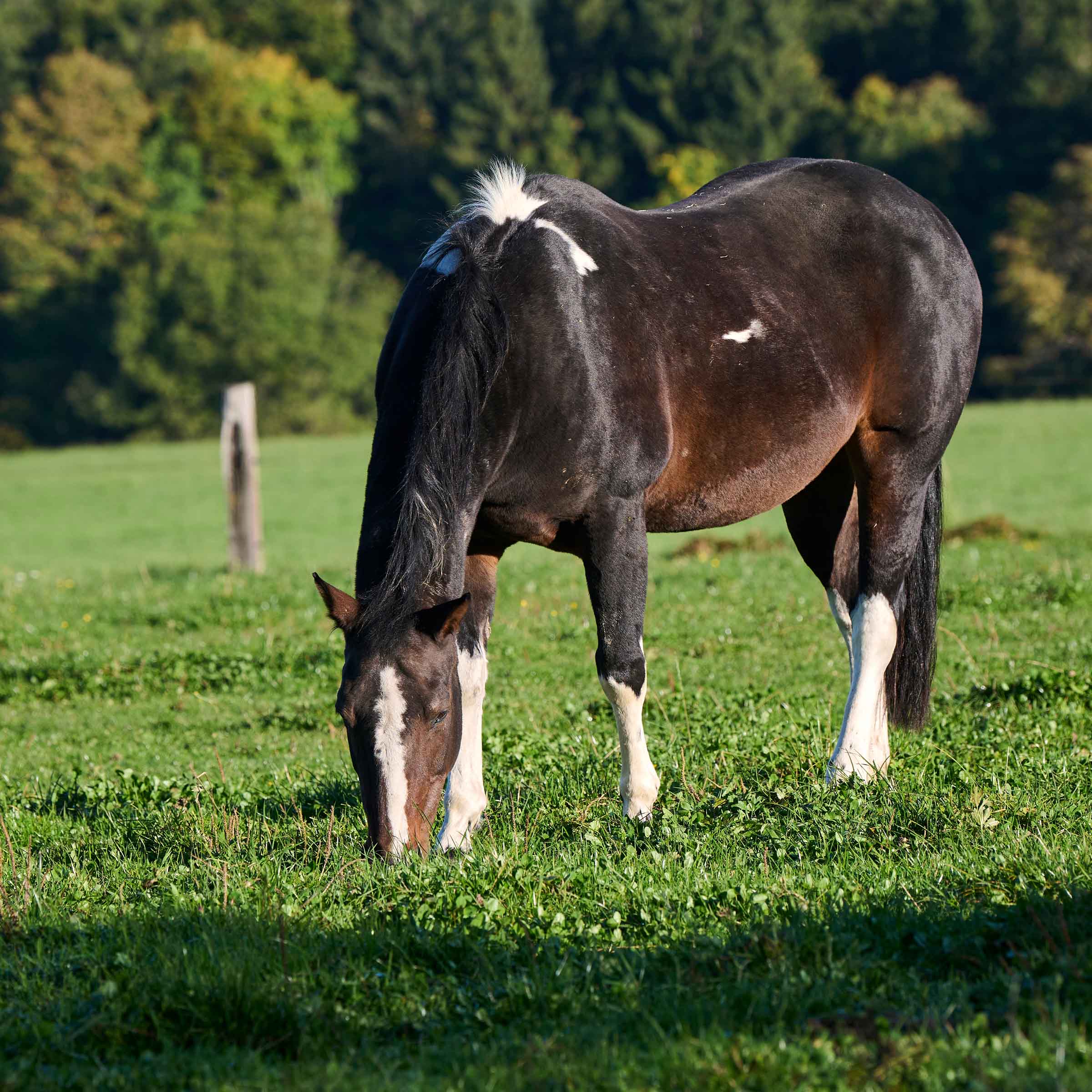 Dunkelbraun-weiss gescheckt mit langgezogener Blesse am Kopf und vier weissen Stiefeln
