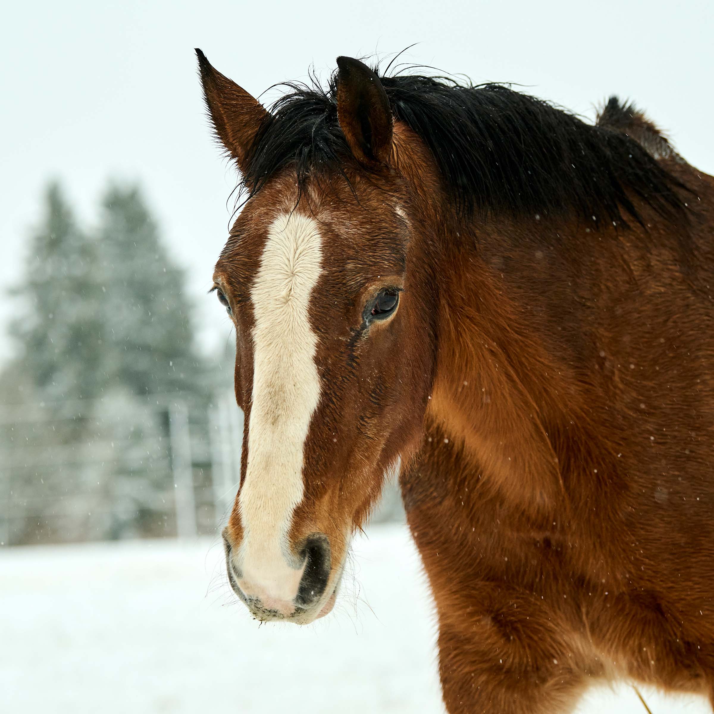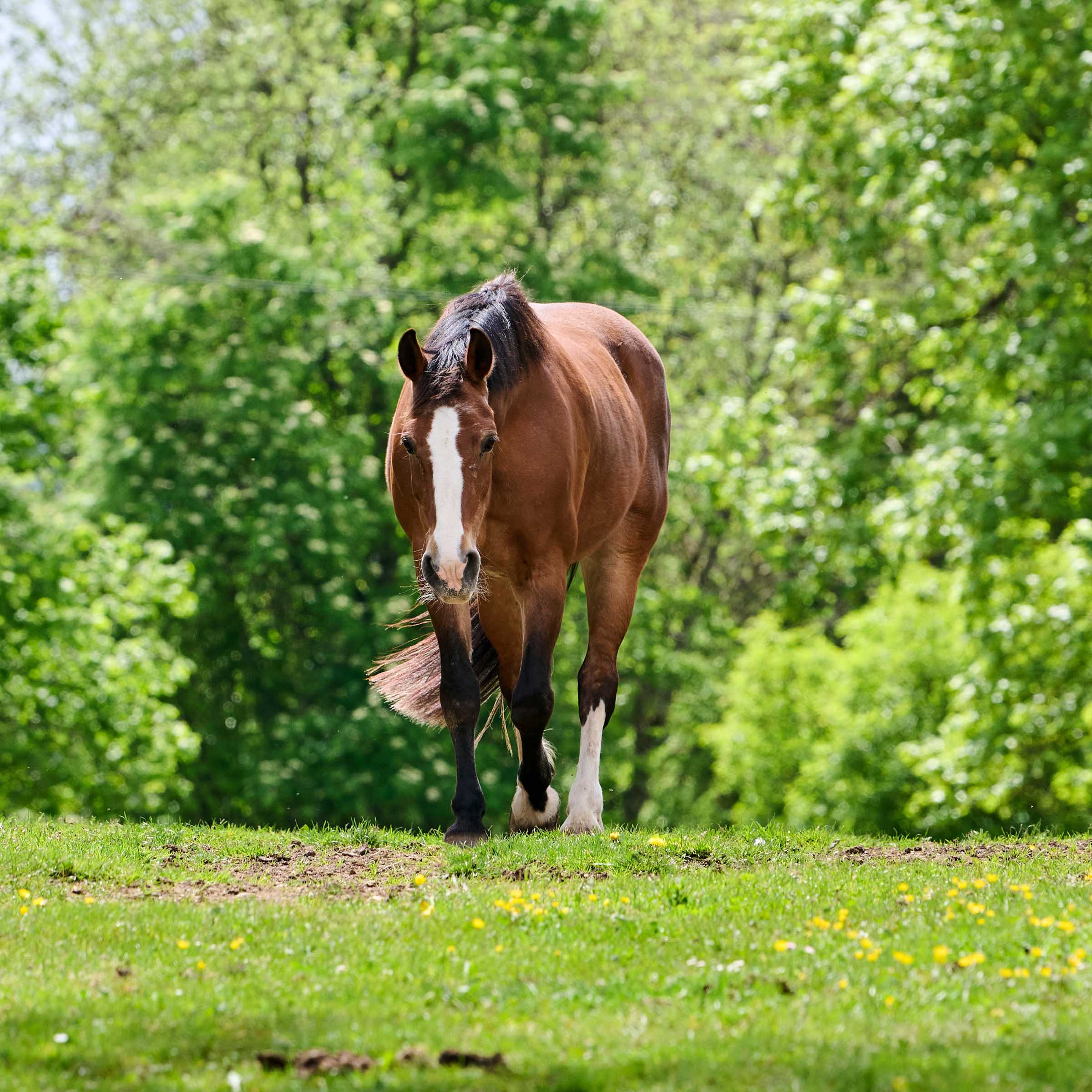 grosse, weisse Blesse bis über die Nüstern; drei weisse Füsse (ausser vorne rechts)