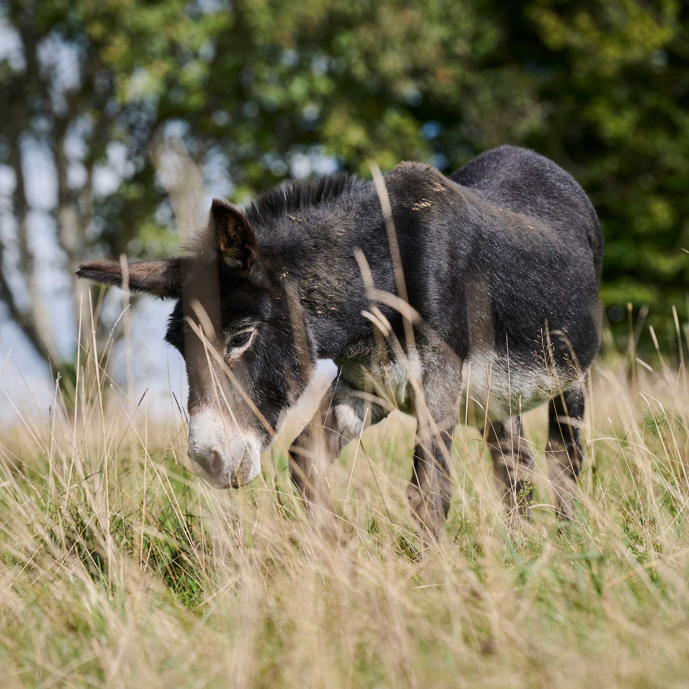 Florian, ein dunkelbrauner Esel, wurde im Jahre 1991 geboren. Seit 2013 lebt er in den Ställen von Maison Rouge zusammen mit vielen anderen Langohren. Dieser Esel ist durch seinen verkürzten Schwanz und sein fast schwarzes Fell etwas einfacher zu erkennen, als seine grauen Gefährten. Die letzten Besitzer übernahmen Florian von ihrer Nachbarin, die wegzog. Er trug Kinder auf seinem Rücken und war bei allen Quartierbewohnern sehr beliebt. Auch lernte Florian einen kleinen Wagen zu ziehen. Durch sein tadelloses und freundliches Verhalten, hatte der aufgestellte Genosse bald seinen ganz persönlichen Fanclub. Sogar der «Samichlaus» durfte jeweils im Dezember auf seine Mithilfe zählen! Im Stall war er das einzige Langohr zusammen mit zwei Schafen und drei Ziegen. Weil die neue Tierschutzverordnung die Einzelhaltung von Pferden oder Eseln verbietet, mussten seine Besitzer für ihn schweren Herzens einen guten Platz finden. Aus diesem Grund kam Florian zu uns. Sofern dem dominanten Esel genügend Beachtung geschenkt wird, klappt das Zusammenleben mit Artgenossen ganz gut. Gegenüber Menschen verhält sich Florian noch immer wie früher: freundlich und lieb.