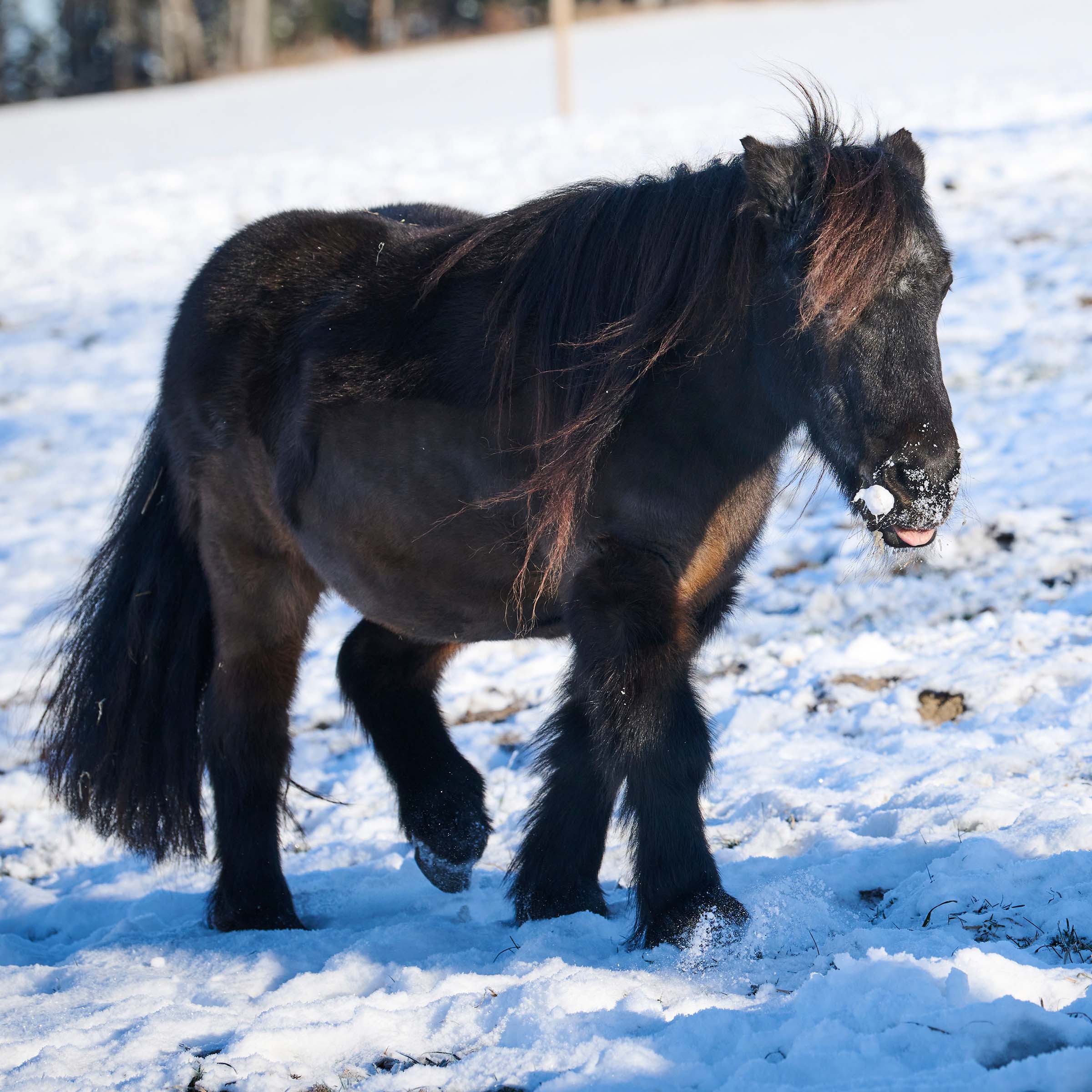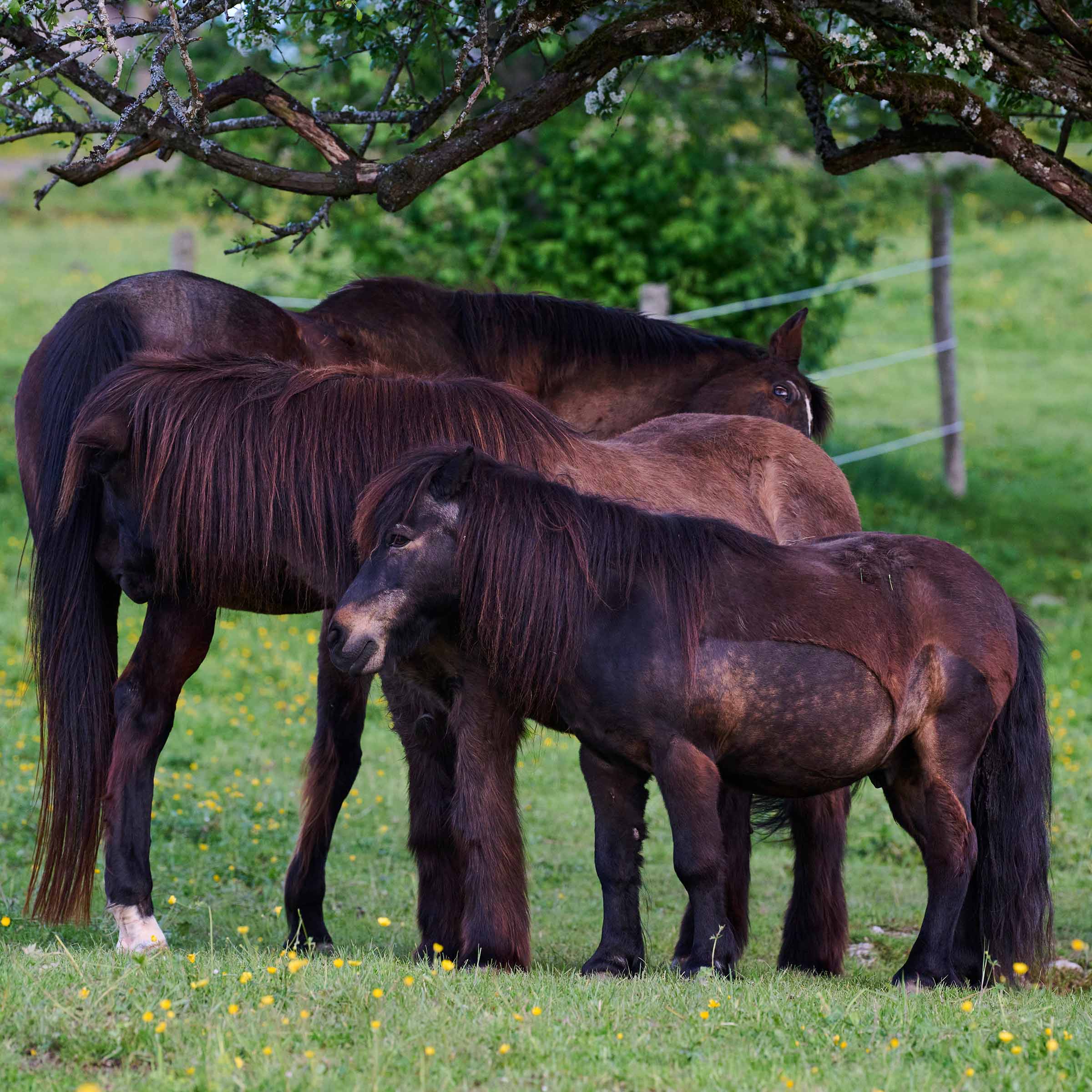 Der dunkelbraune Shetty-Wallach ist am 19. Mai 2003 geboren. Über seine Kindheit und Jugendtage ist uns nichts bekannt. Zu seiner letzten Besitzerin kam Jamir im Jahr 2012 zusammen mit der Scheck-Stute Tanisha, die seit Juli 2023 ihre Rente auf dem Jeanbrenin verbringt. Die beiden lebten in Offenstallhaltung mit Zugang zu einem Auslauf. Während seine grosse Freundin täglich geritten wurde, profitierte Jamir von regelmässigen Spaziergängen mit seinen Menschen. Im Winter verbrachten Jamir und Tanisha jeweils mehrere Monate auf einer Winterweide mit anderen Pferden. Weil Jamir mit einer besonders grossen Portion Neugierde und Selbstvertrauen ausgestattet ist, versteht er sich problemlos mit grösseren Pferden. Seit Februar 2024 lebt der Lausbube nun in Le Roselet. Wie schon bei vier seiner Artgenossen, war auch bei Jamir schnell klar, dass er für die kleineren Shettys zu stürmisch ist. Also verbringt der Dreikäsehoch seinen Alltag in der Herde der Grosspferde.