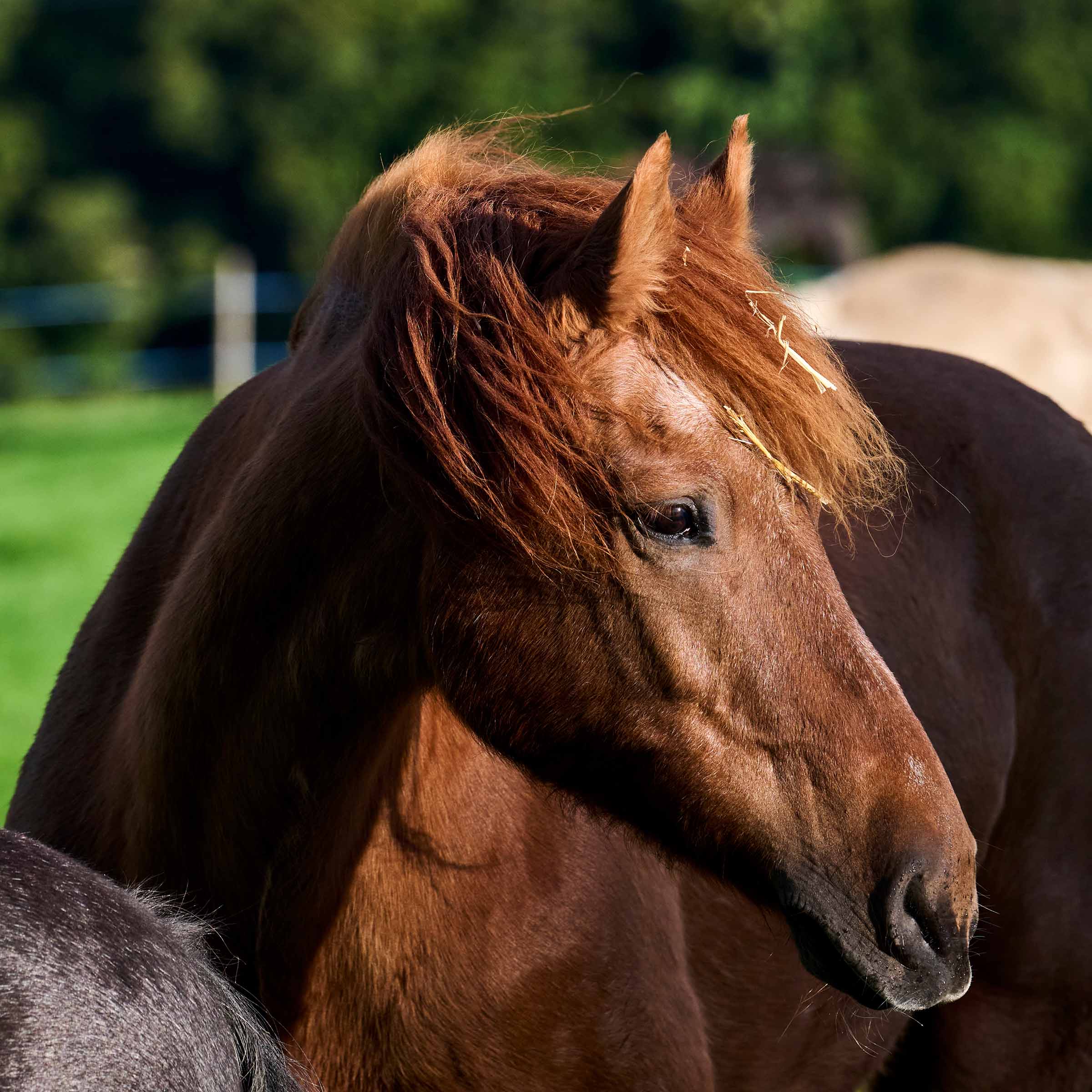 Der fuchsfarbene Freiberger-Wallach kam im November 2011 nach Le Roselet. Leandro wurde als dreijähriges vernachlässigtes Pferd von seiner Besitzerin erworben. Dank guter Pflege und viel Geduld im Umgang mit ihm, entwickelte sich der 144 cm grosse Freiberger zu einem verschmusten Pferd. 2011 durfte er zu uns in den Jura reisen, da sich seine schwer erkrankte Besitzerin nicht mehr um ihre Tiere kümmern konnte. Das Einleben war für Leandro stressig, nur langsam gewöhnten sich die beiden an ihre neue Umgebung. Mittlerweile geniesst der muntere Freiberger allerdings sein Leben in der Herde und auf den Juraweiden in vollen Zügen. Wir wünschen ihm noch viele schöne Tage bei uns.