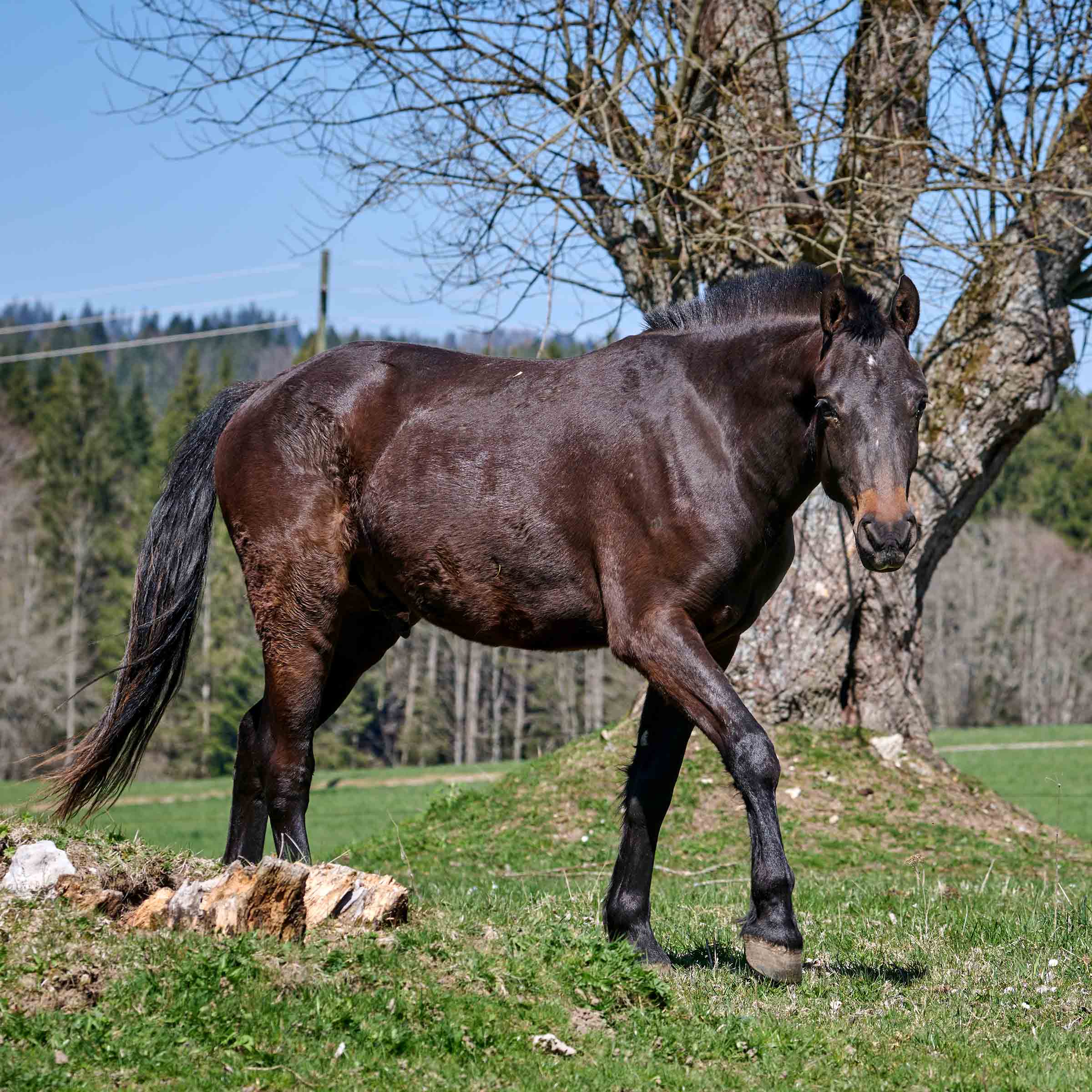 Am 13. April 2023 schenkte unsere Freibergerstute «Ebène» ihrem dritten Fohlen das Leben: Ein hübscher, gesunder kleiner Hengst hat das Licht der Welt erblickt! «Luigi» ist der Vollbruder von Loxer und Loxias, dem ersten beiden Fohlen von Ebène. Der Vater des kleinen Schönlings heisst «Loxy de la vieille». Luigi bleibt während seiner Jugendjahre in der kleineren Herde von Le Roselet, welche die Sommermonate auf der Gemeindeweide verbringt.