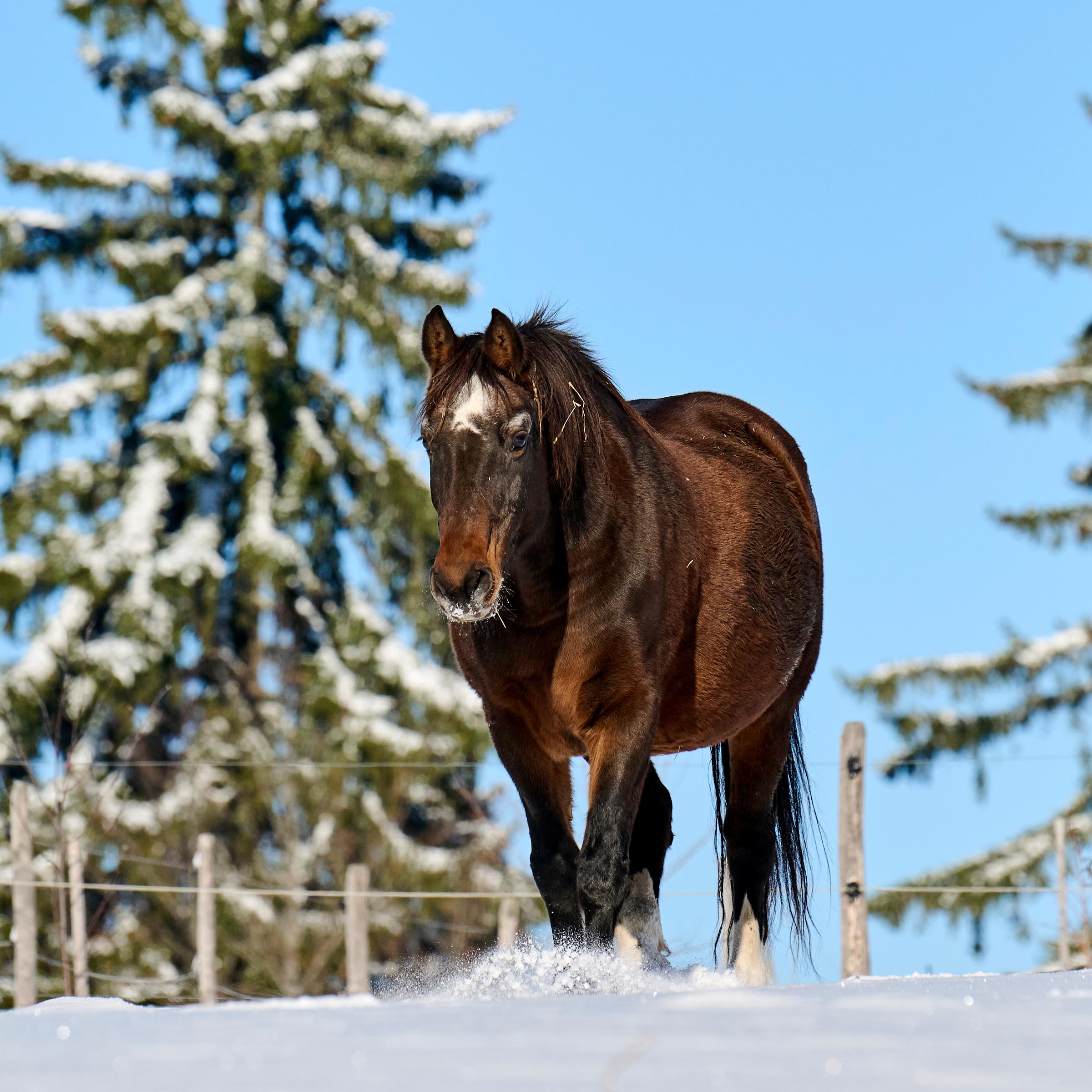 weisser Stern auf der Stirn sowie graue haare über den Augenbögen; drei weiss Füsse (ausser vorne rechts)