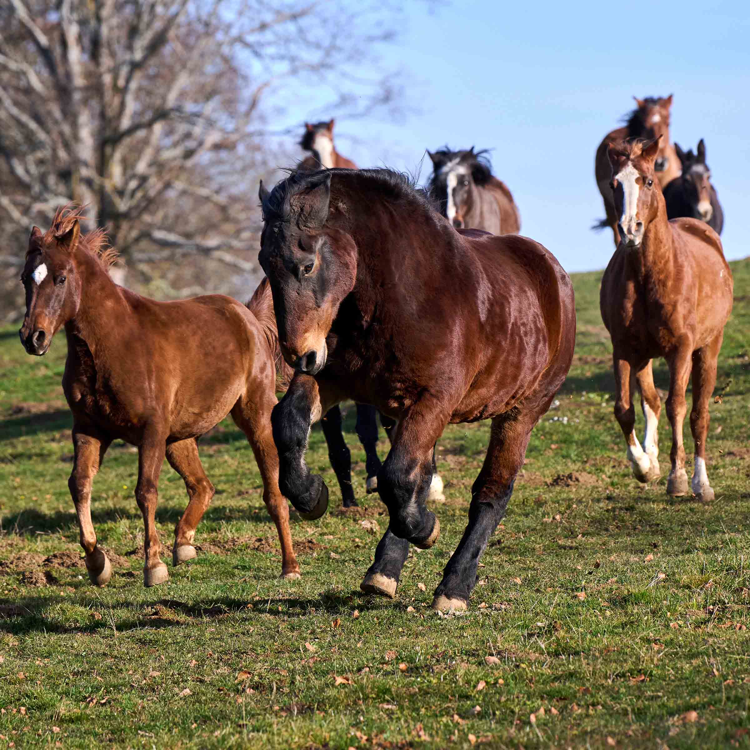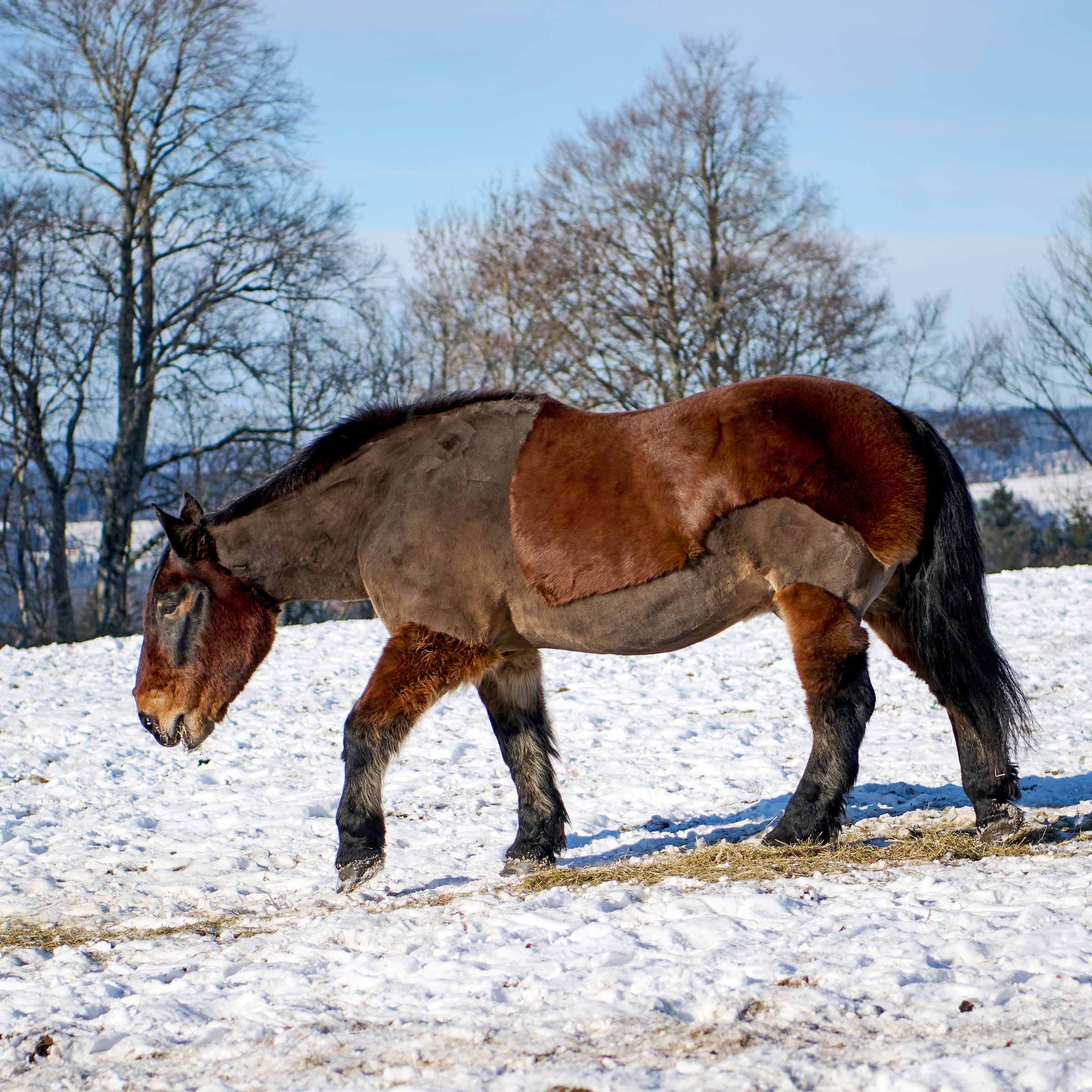 In Österreich geboren, wurde Oski als Fohlen gekauft und in die Schweiz, ins Bündnerland, importiert. Auch nach einem Besitzerwechsel nach zehn Jahren blieb er in Graubünden. Im Winter zog er zusammen mit einer Stute eine Kutsche, zur grossen Freude vieler Touristen. Im Sommer ruhte er sich auf einer Alpweide aus, zusammen mit anderen Pferden und vielen Ziegen. Als Oski älter wurde, war es dem Besitzer ein Anliegen, dass sein Pferd noch ein paar Jahre auf weitläufigen Weiden und umgeben von anderen Pferden verbringen kann. So kam der mächtige Noriker im September 2020 nach Maison Rouge. Oski ist ein umgängliches Pferd und beliebt bei den Stuten.