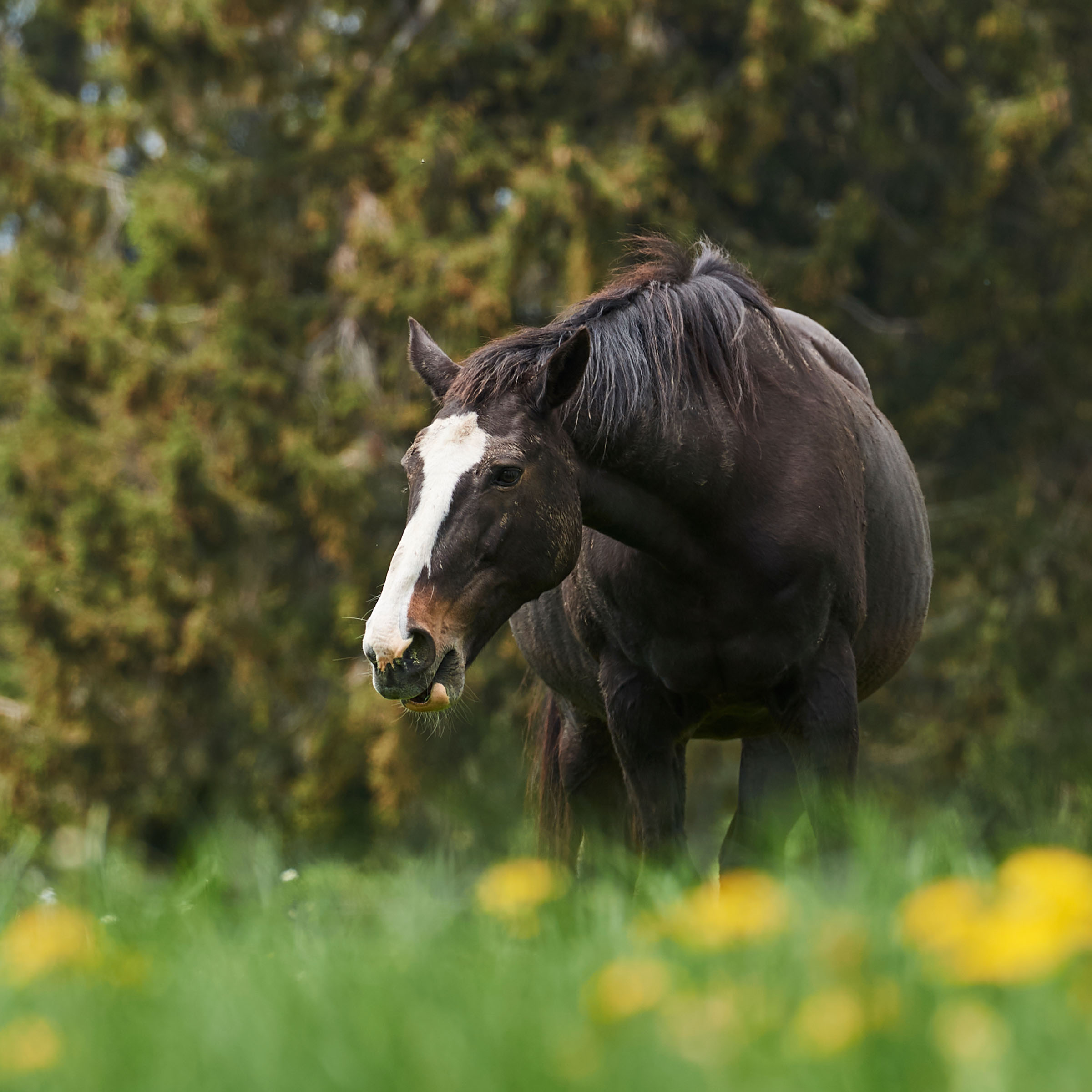 grosse, weisse Blesse bis über die Nüstern; drei weisse Beine (ausser vorne rechts)
