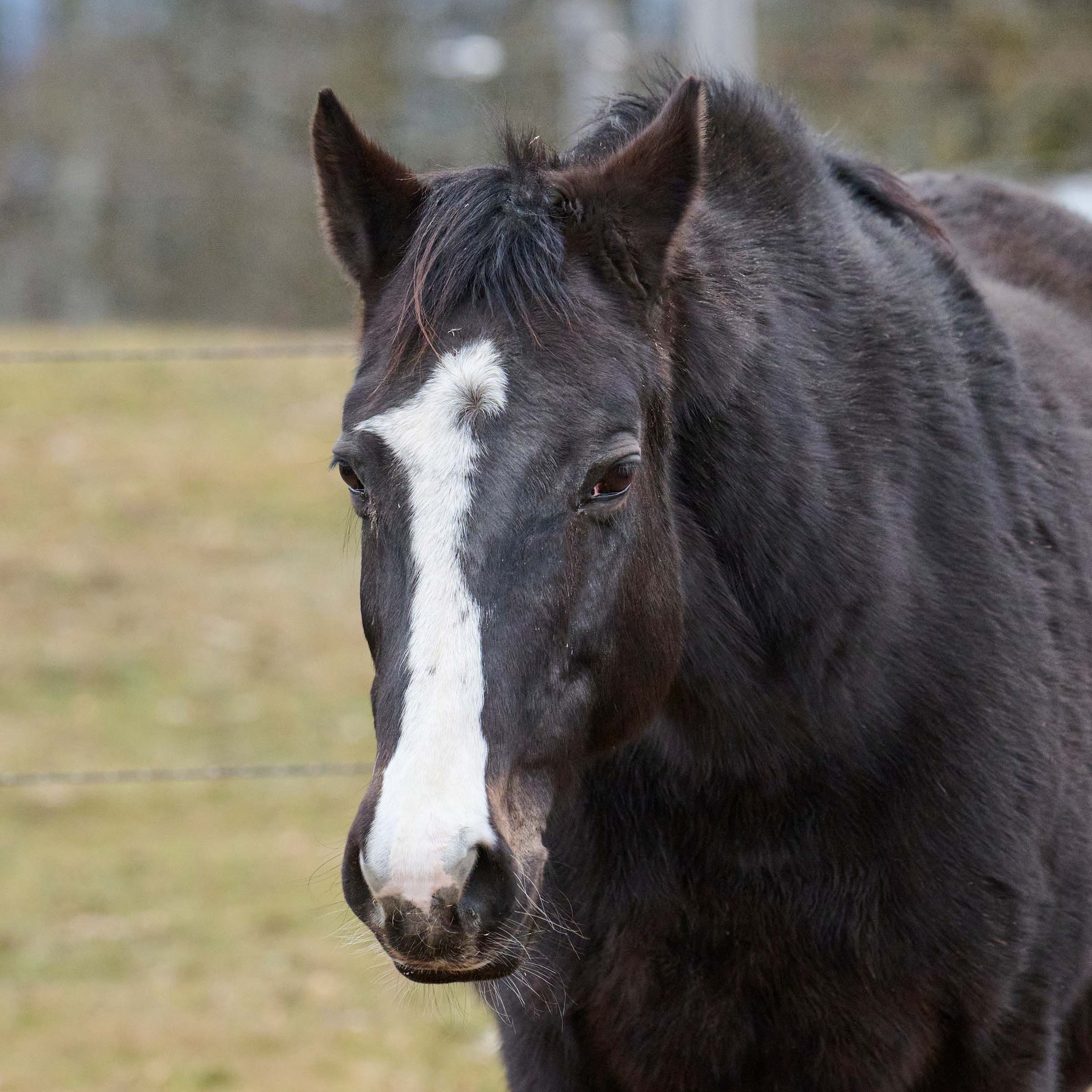 scheint eher schwarz als dunkelbraun; grosse, weisse Blesse; zwei weisse Füsse links