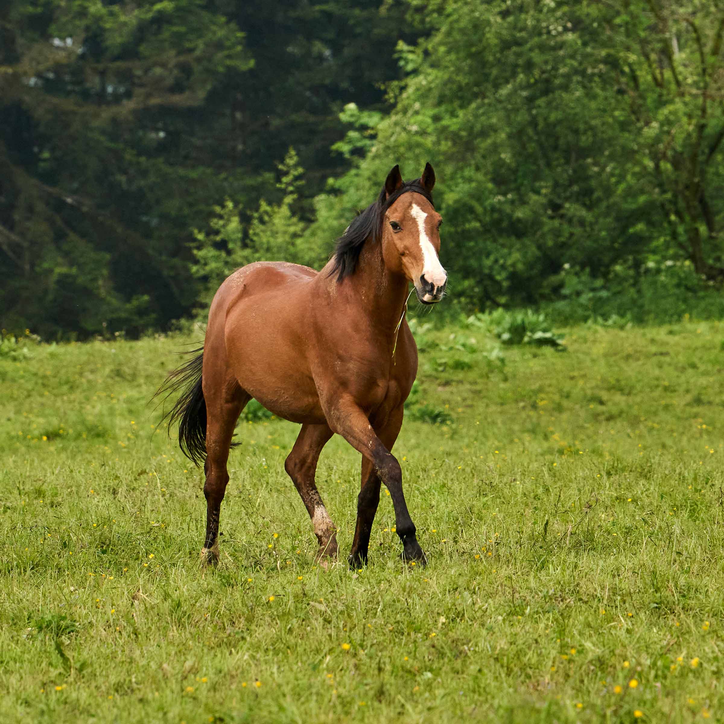 weisse Blesse am Kopf; beide Hinterbeine haben Weissabzeichen
