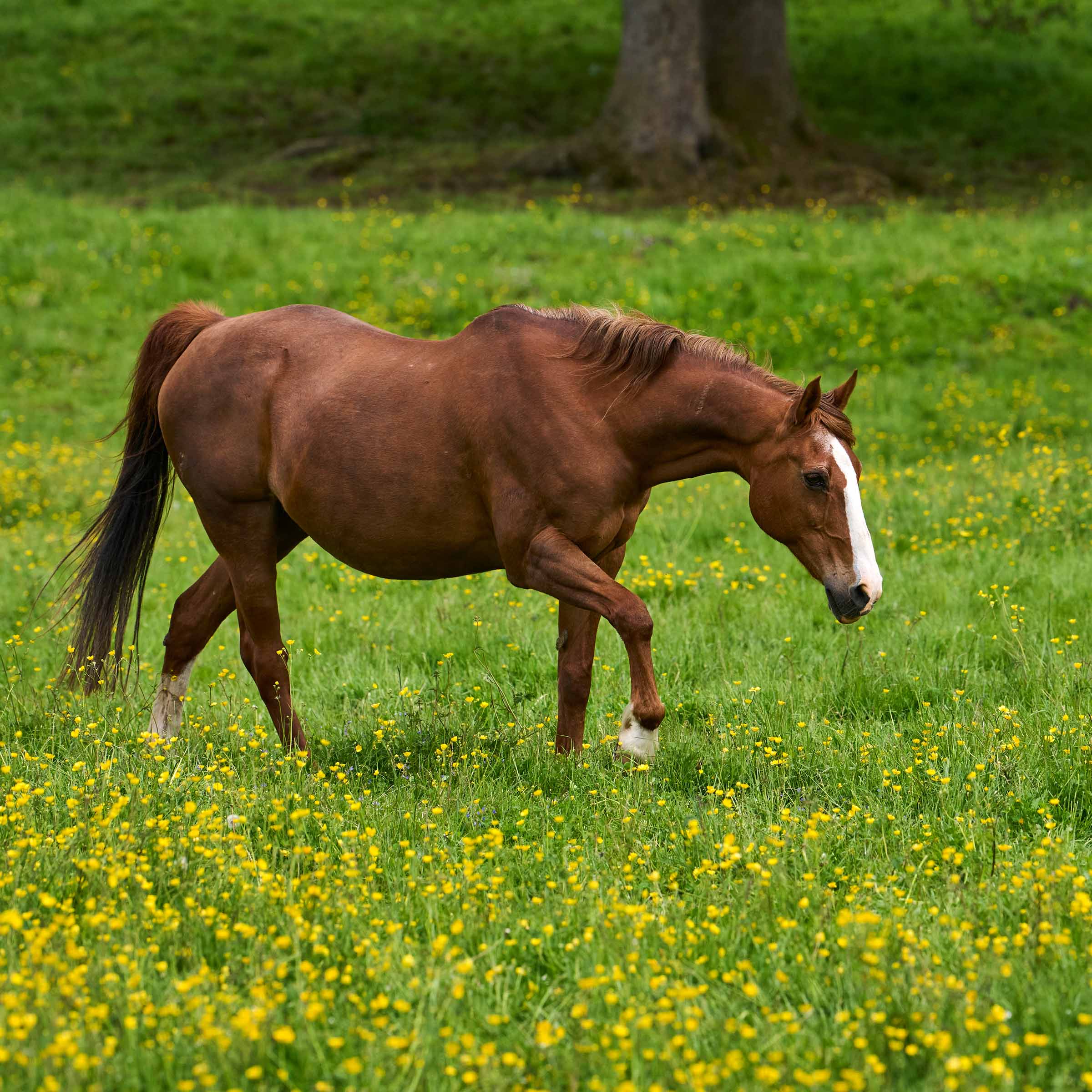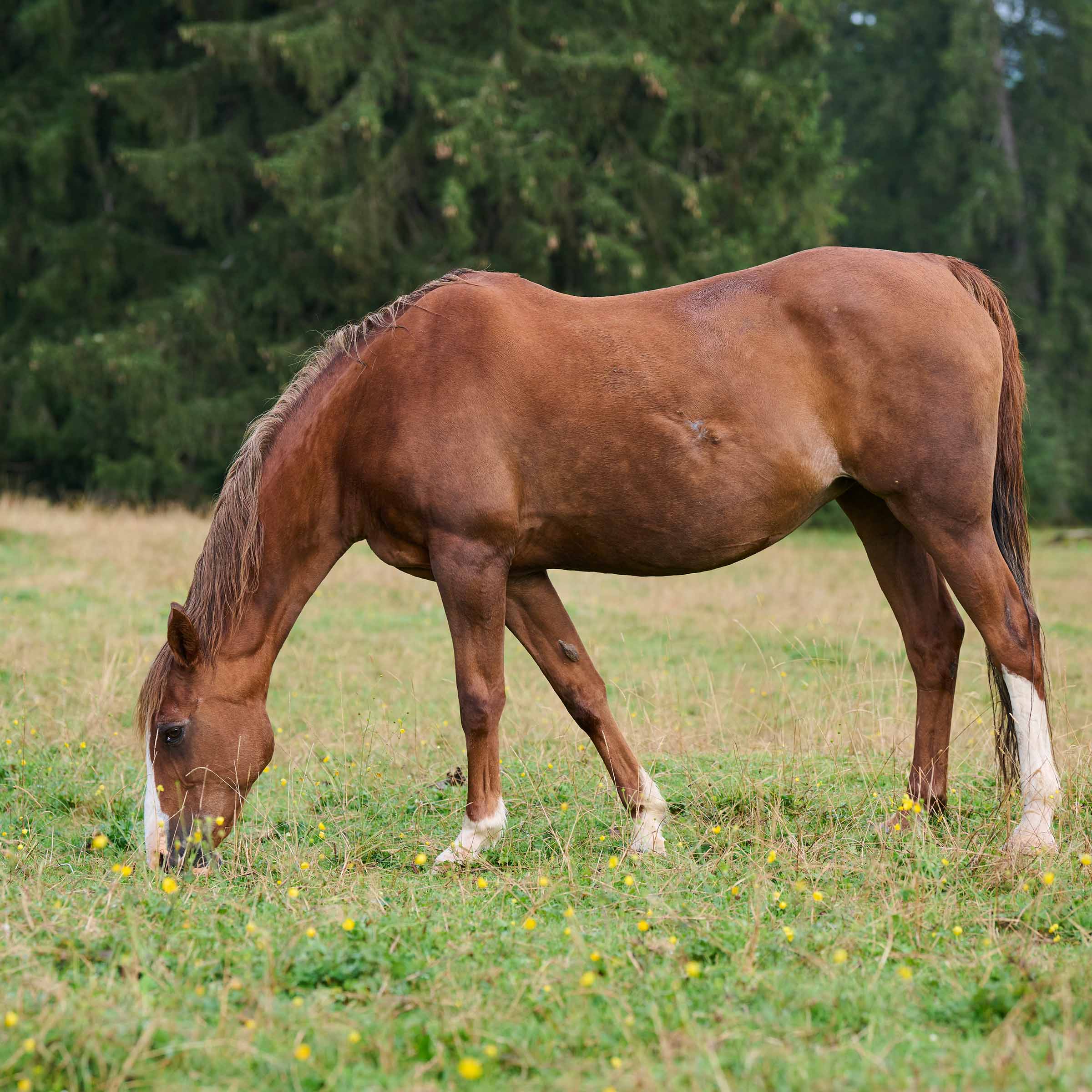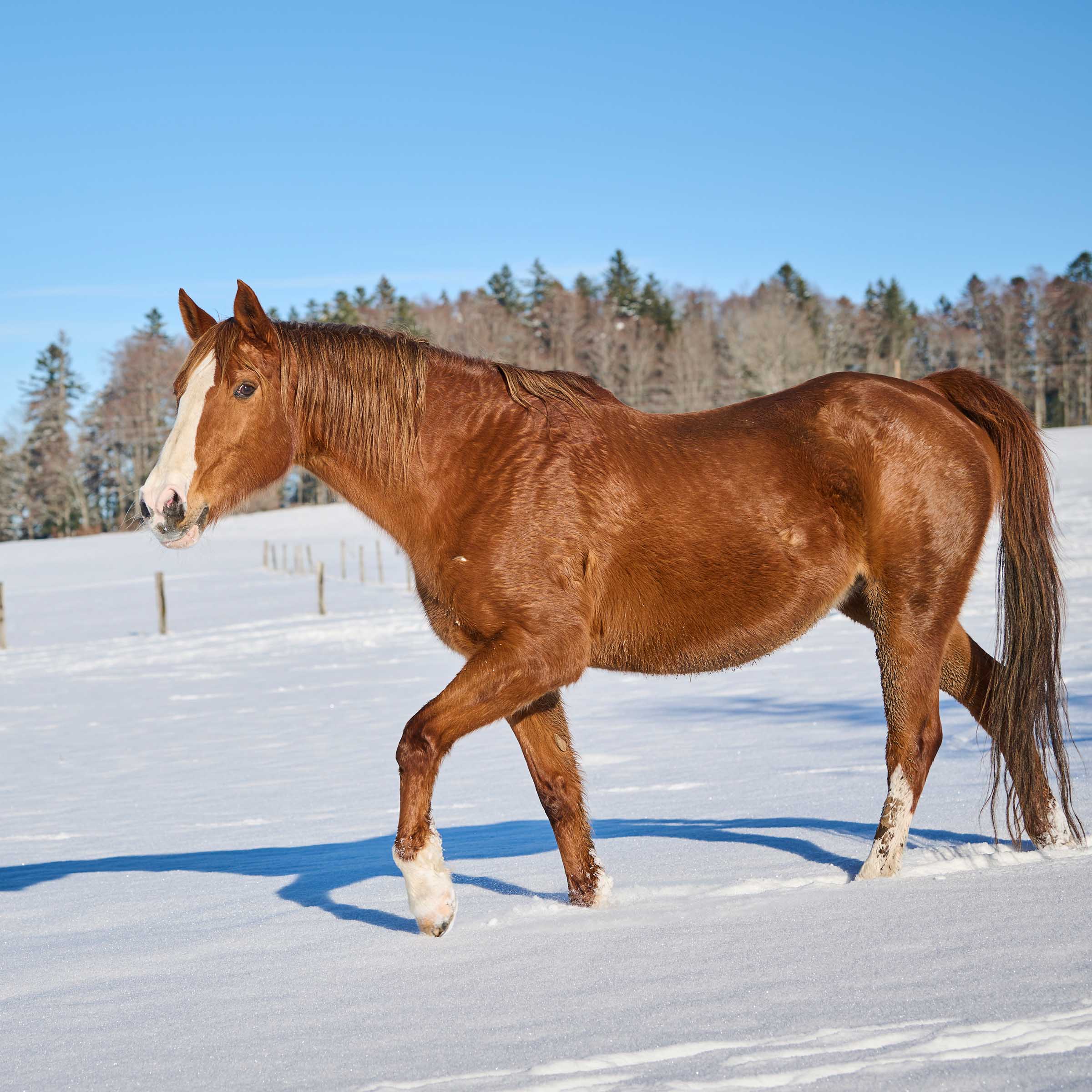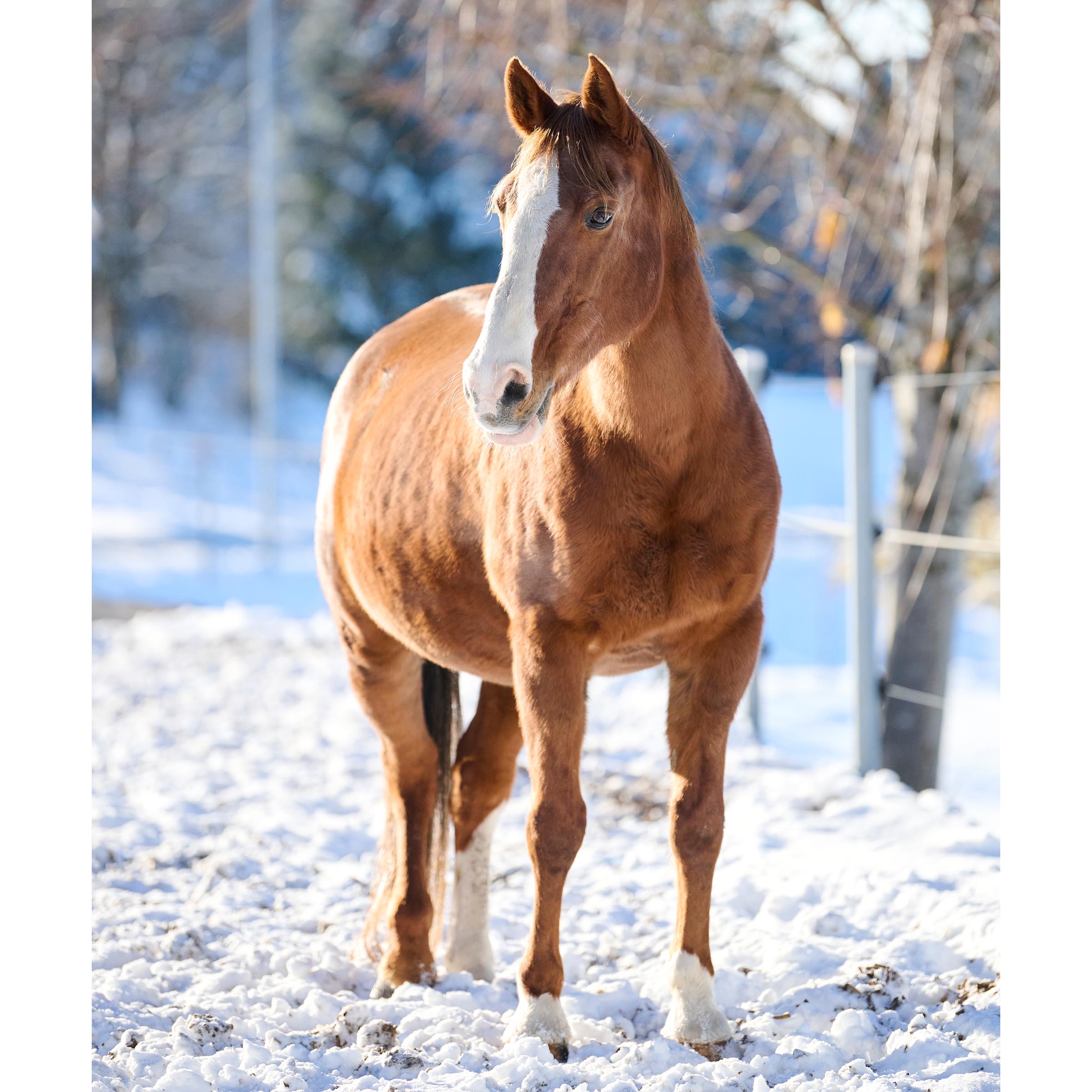 grosse weisse Blesse bis über die Nüstern; drei weisse Füsse (ausser hinten rechts)