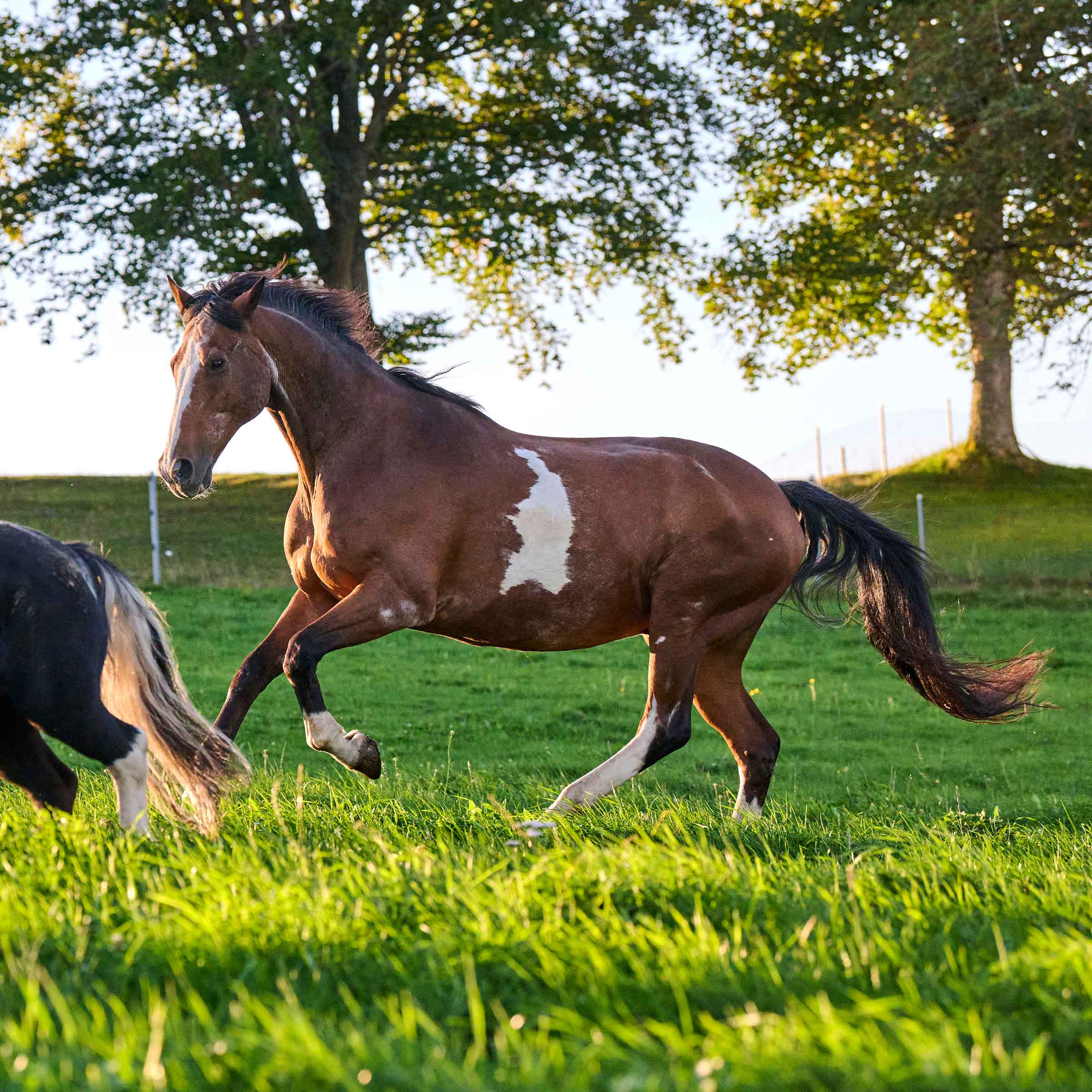 grosser, weisser Fleck an linker Bauchseite; vier weisse Beine; grosse weisse Blesse