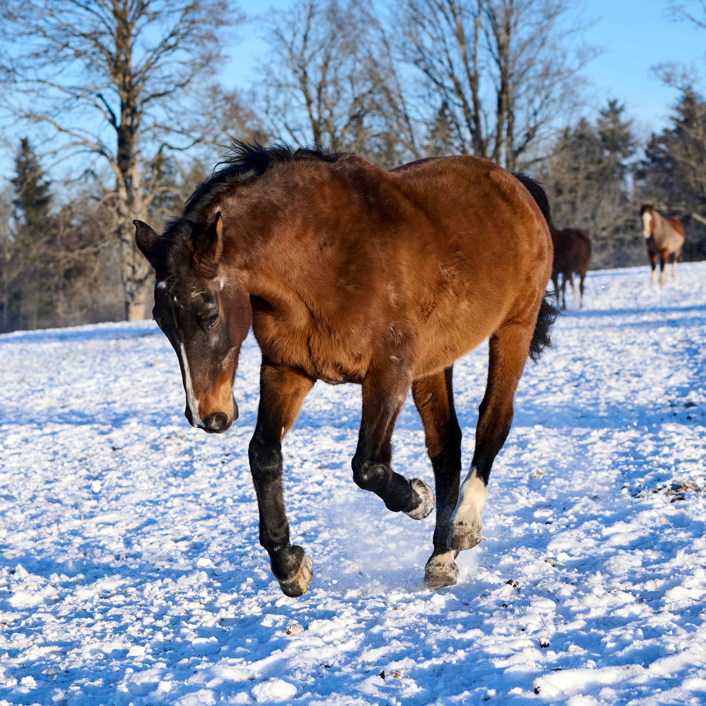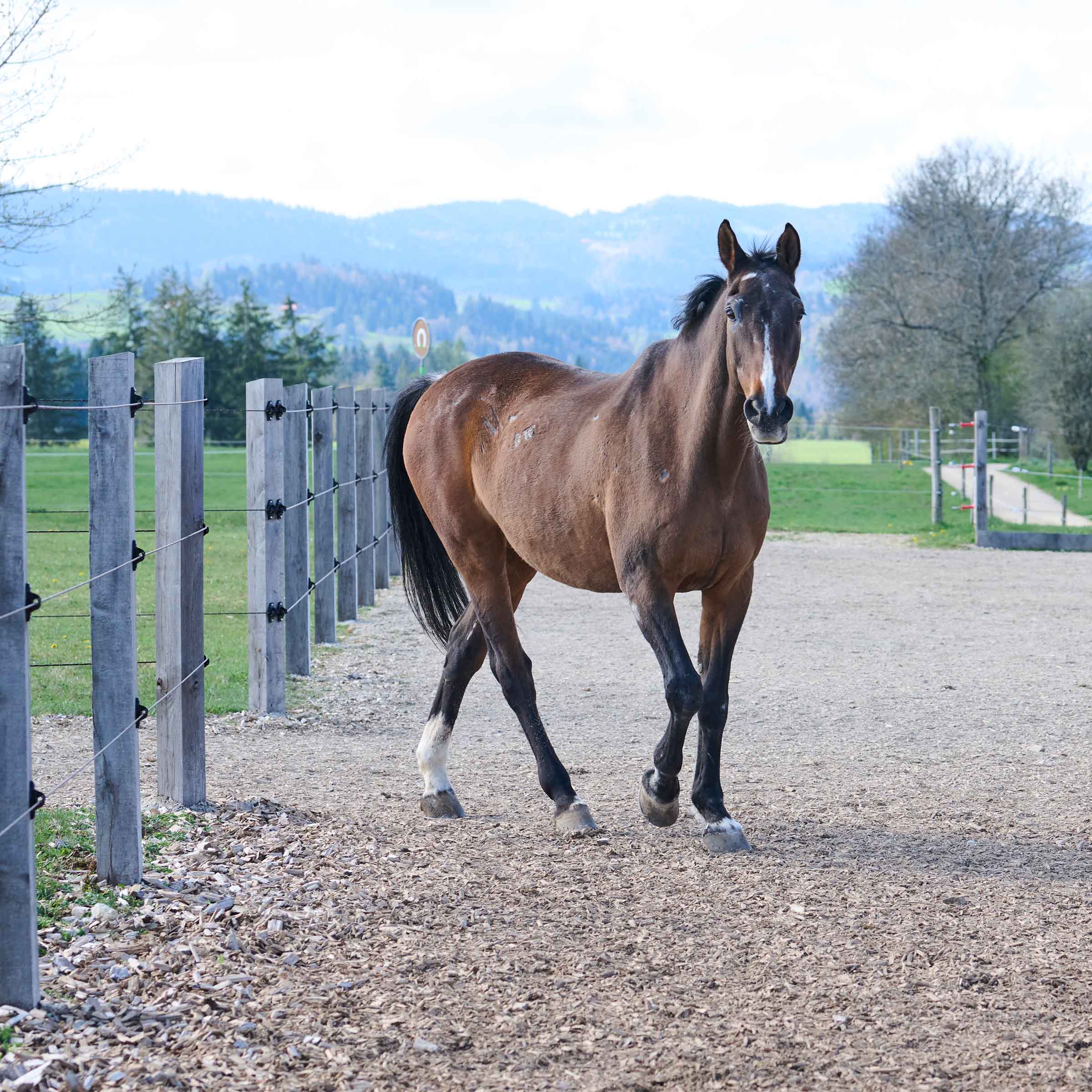 dünne blesse auf Nasenrücken; linker Hinter- und Vorderfuss weiss